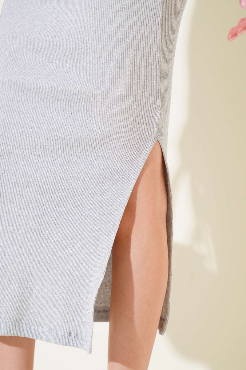 Fitilli Yırtmaçlı Midi Kalem Etek Gri