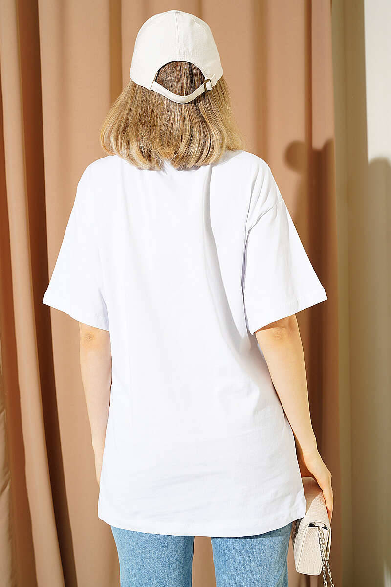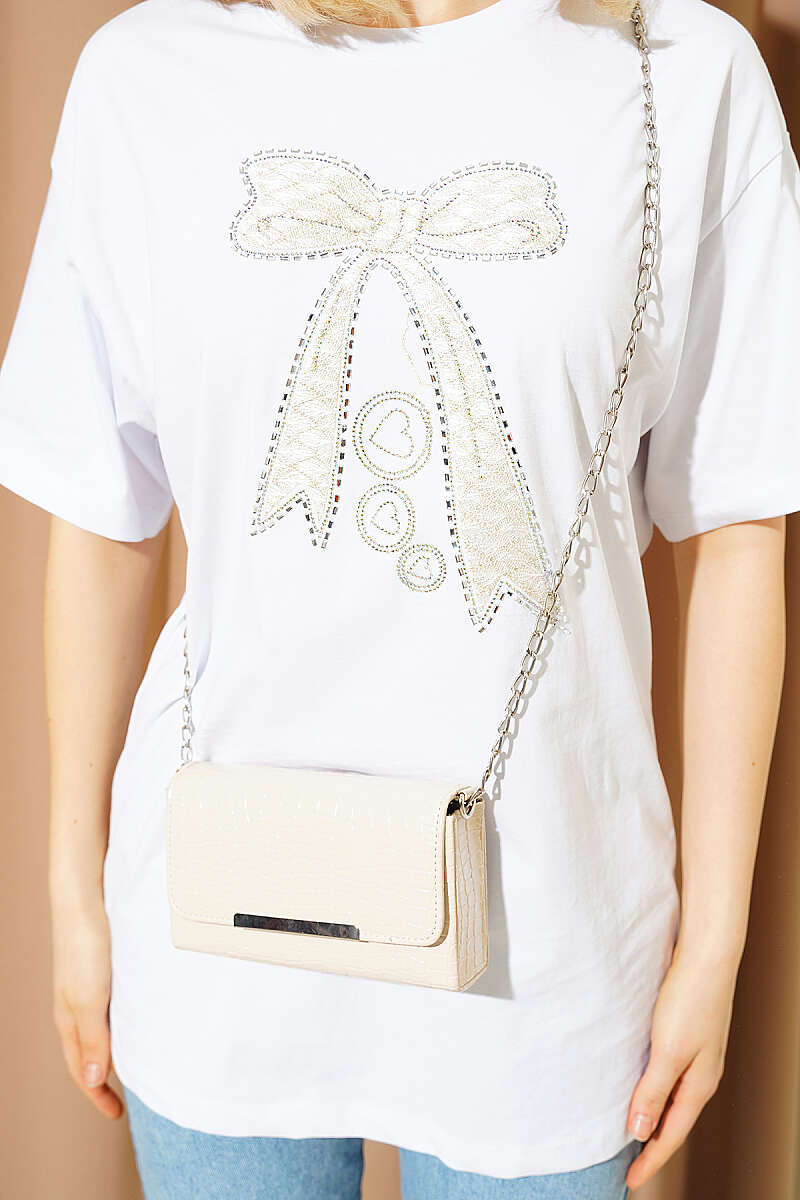 Fiyonk Baskılı Mini Taşlı T-shirt Beyaz