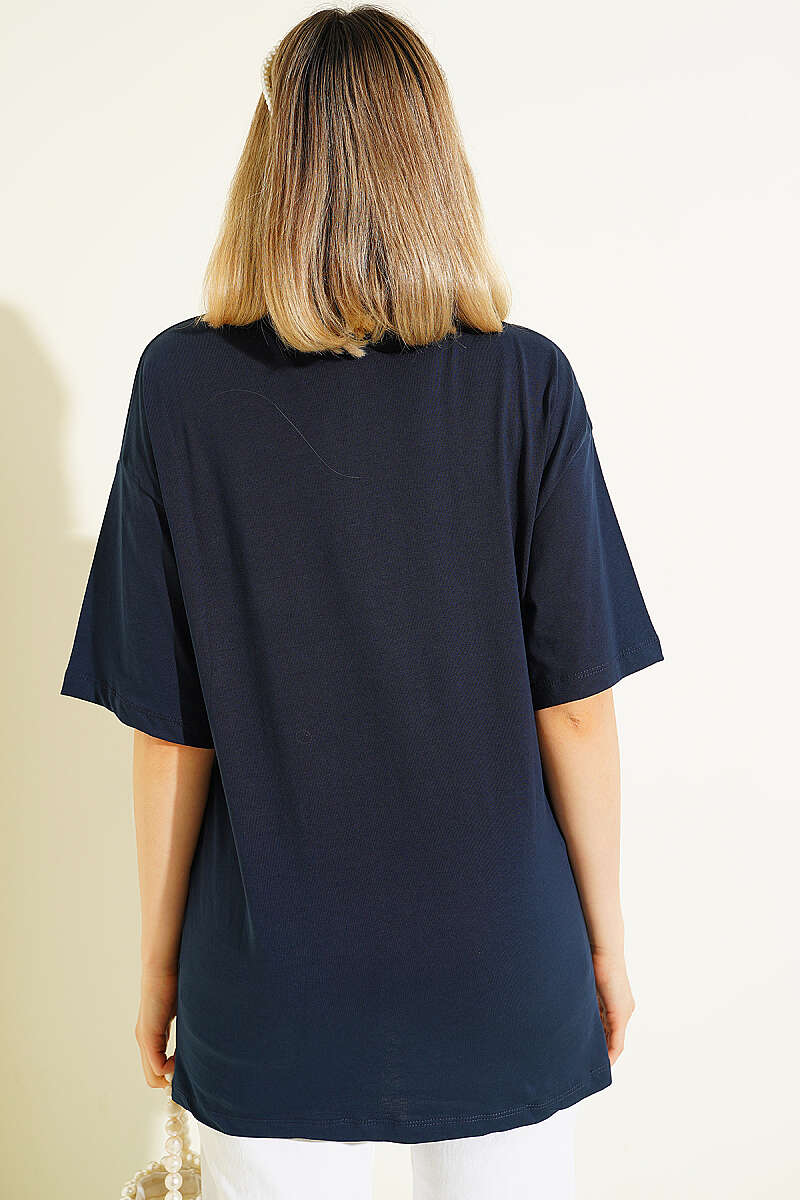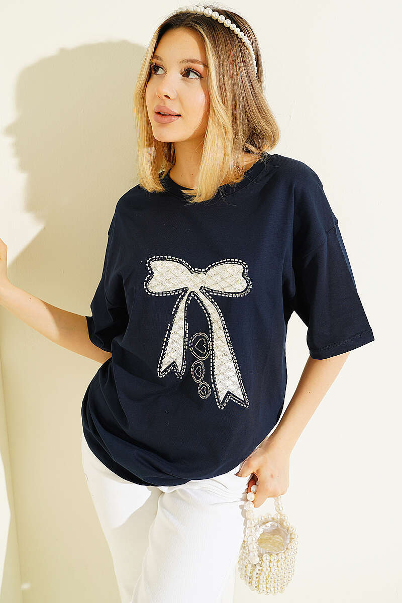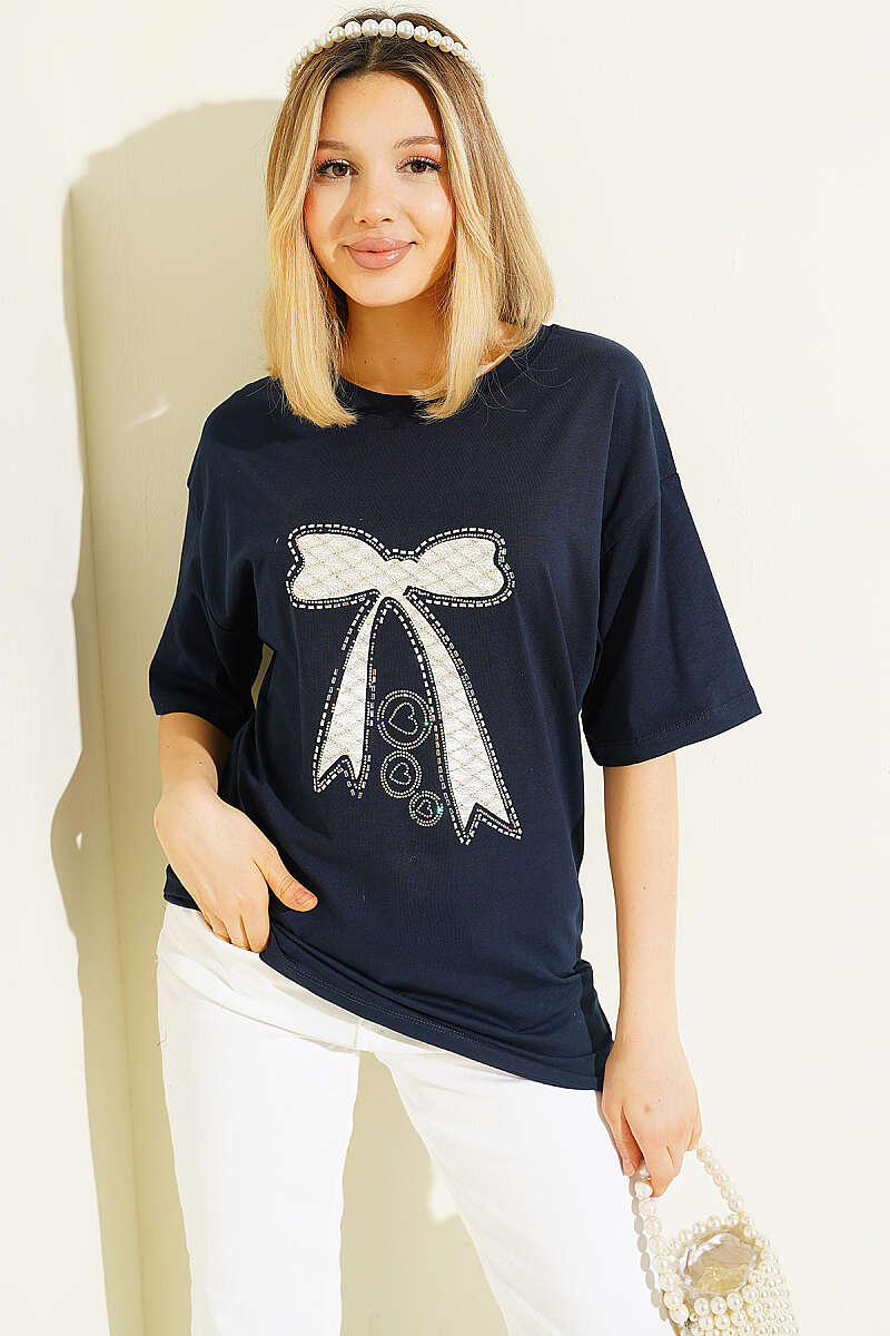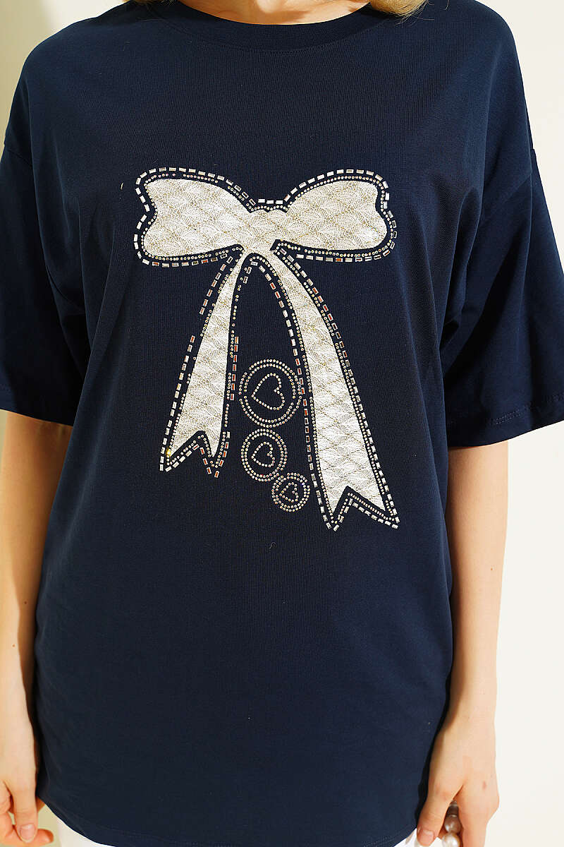 Fiyonk Baskılı Mini Taşlı T-shirt Lacivert