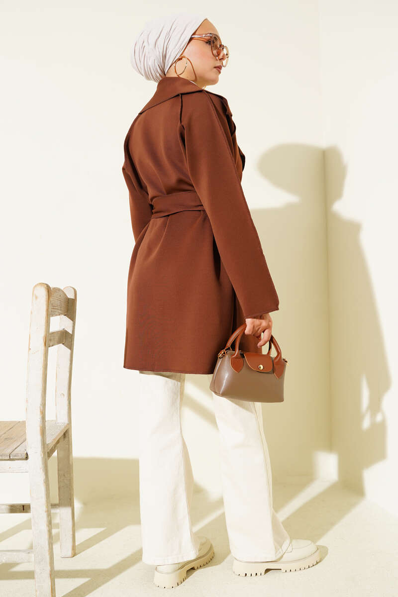 Gömlek Yaka İp Kuşaklı Deri Ceket Kahve