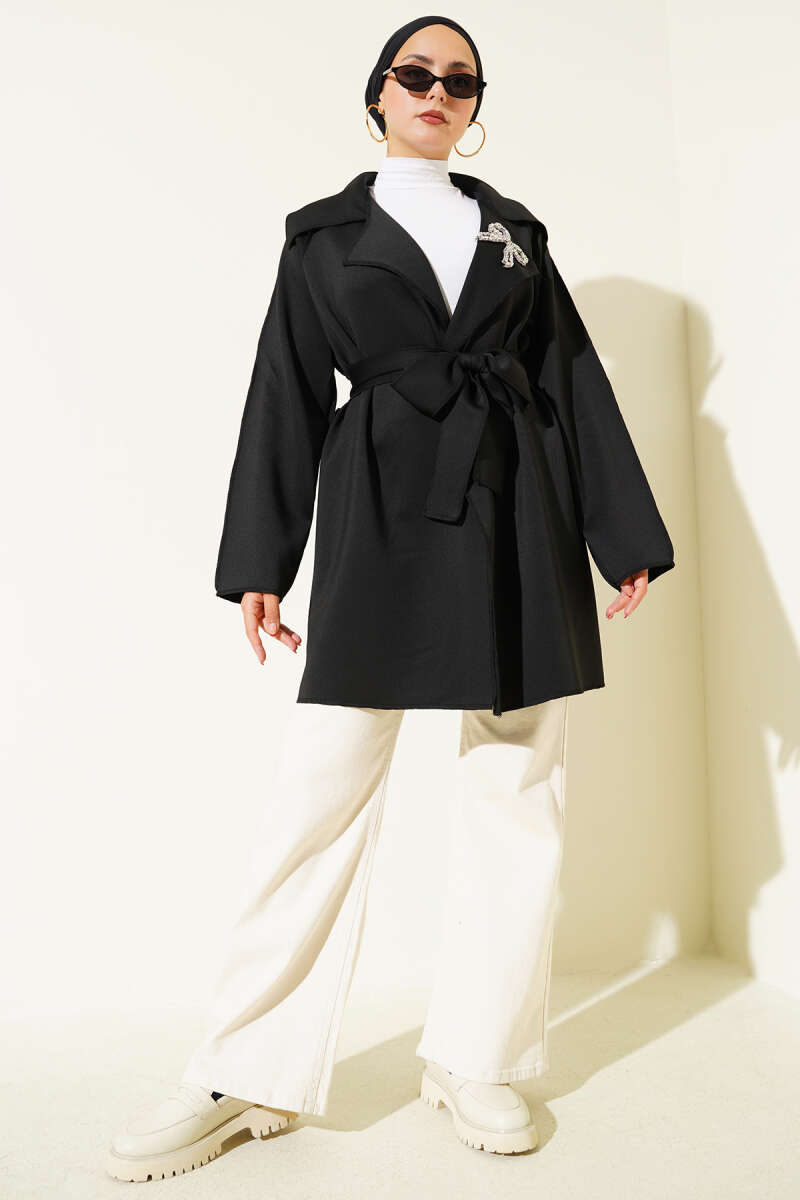 Tek Düğmeli Kemerli Sakallı Ceket Siyah