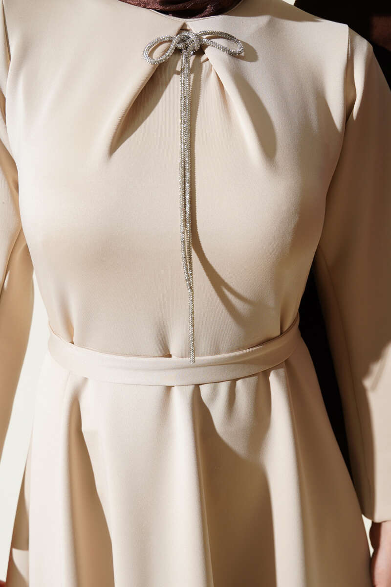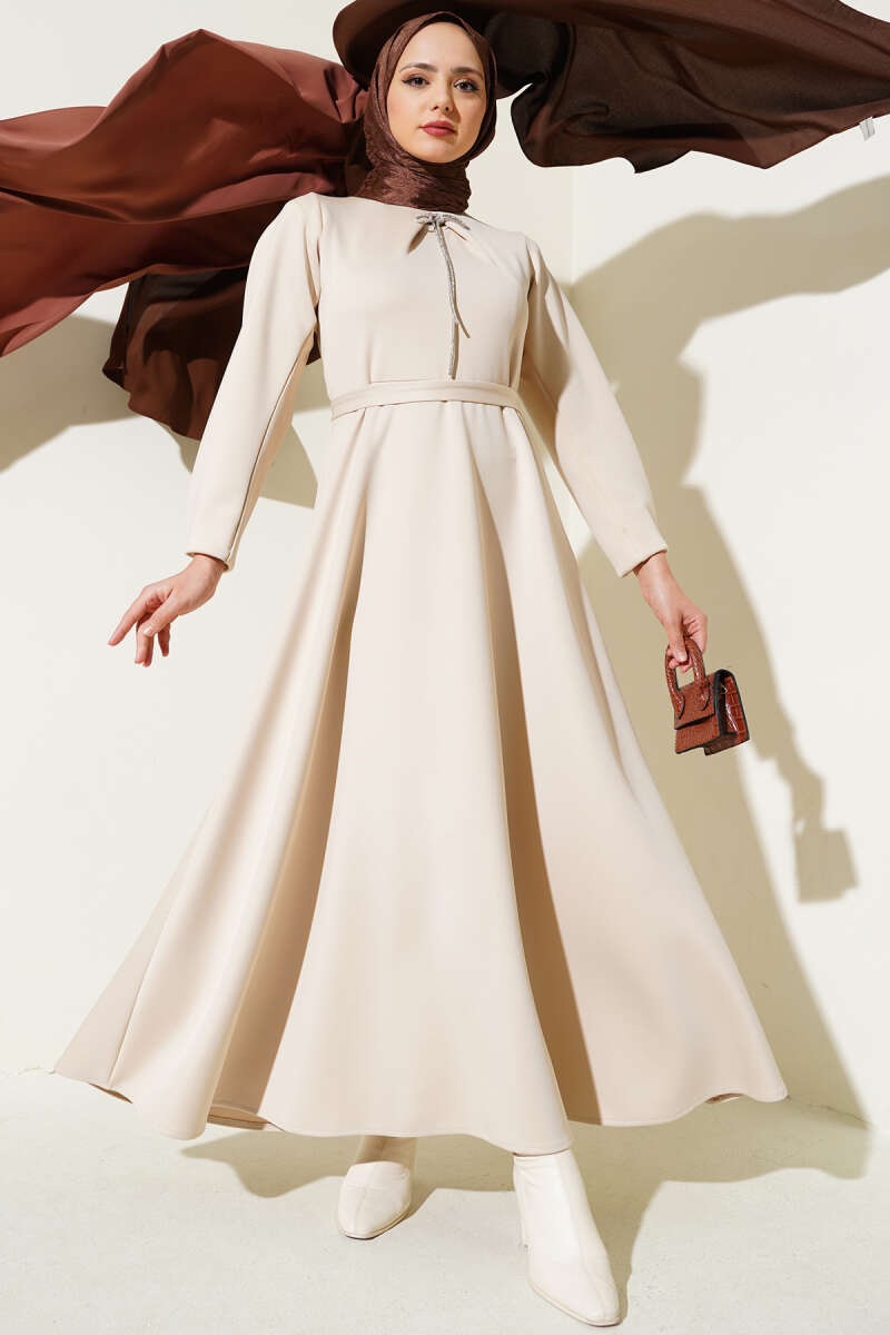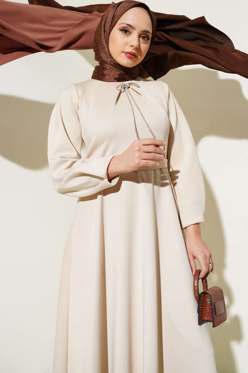 Kolları Fiyonk Detaylı Selanik Elbise Taş