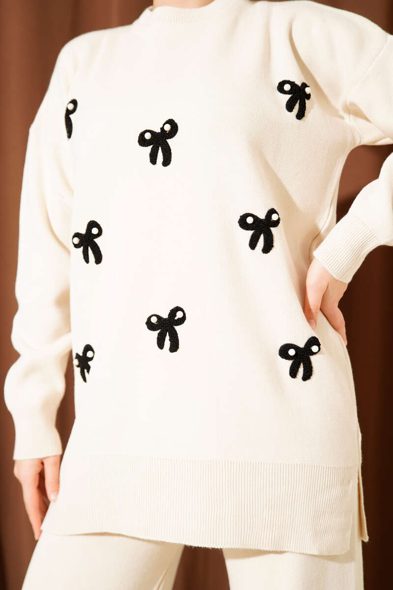 Fiyonk Desenli İncili Triko İkili Takım Latte