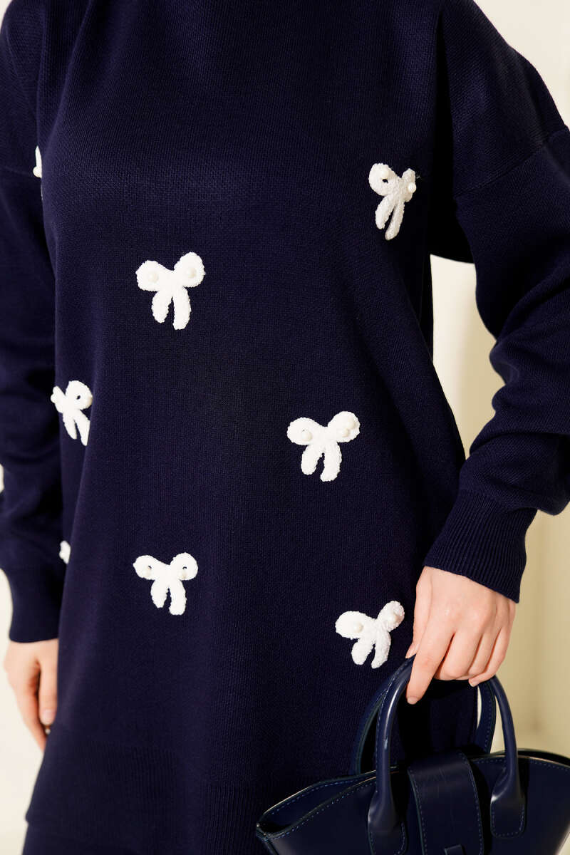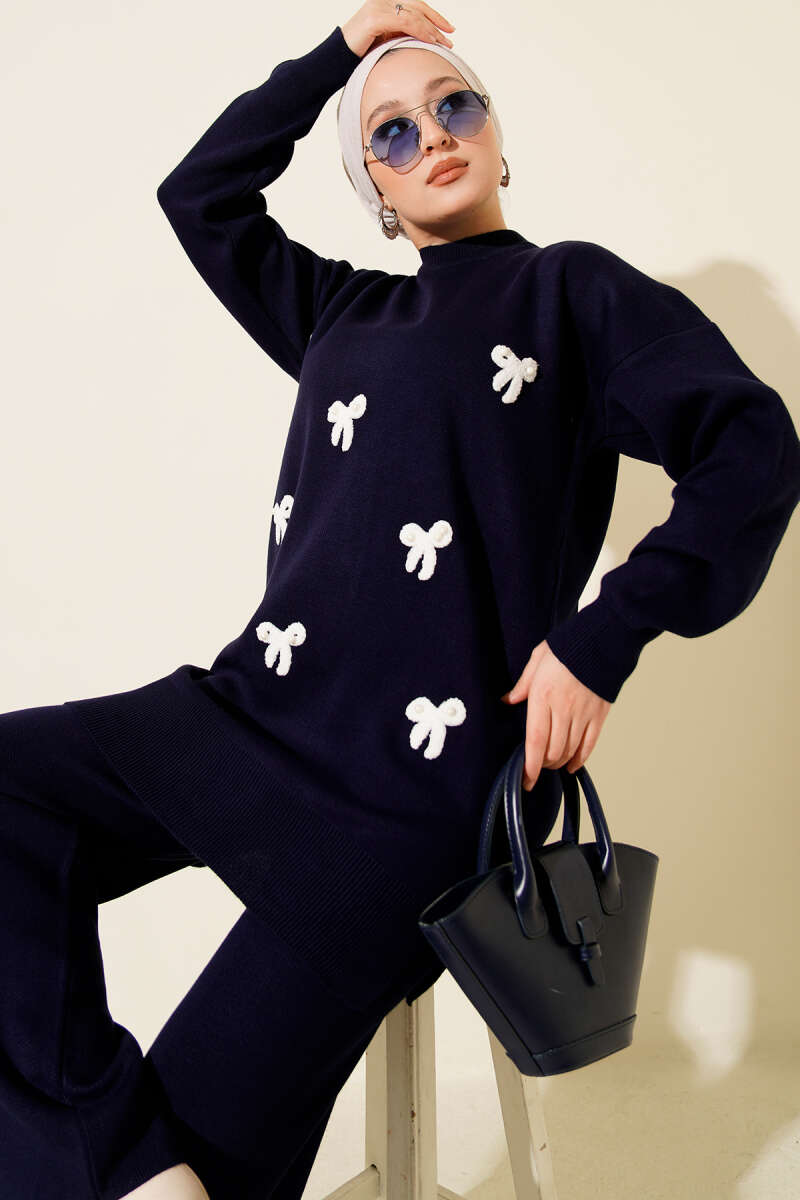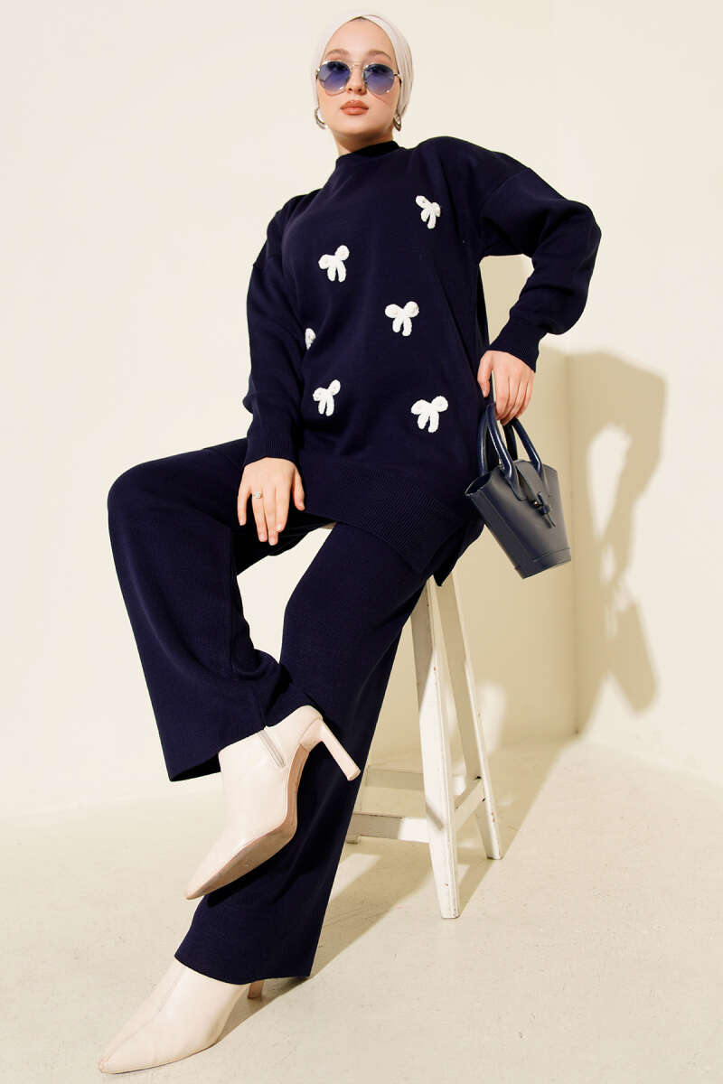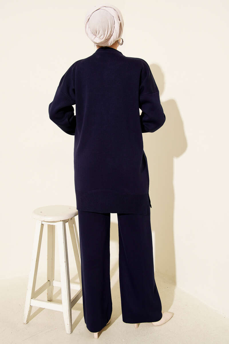 Şerit Detaylı Düğmeli Triko İkili Takım Lacivert