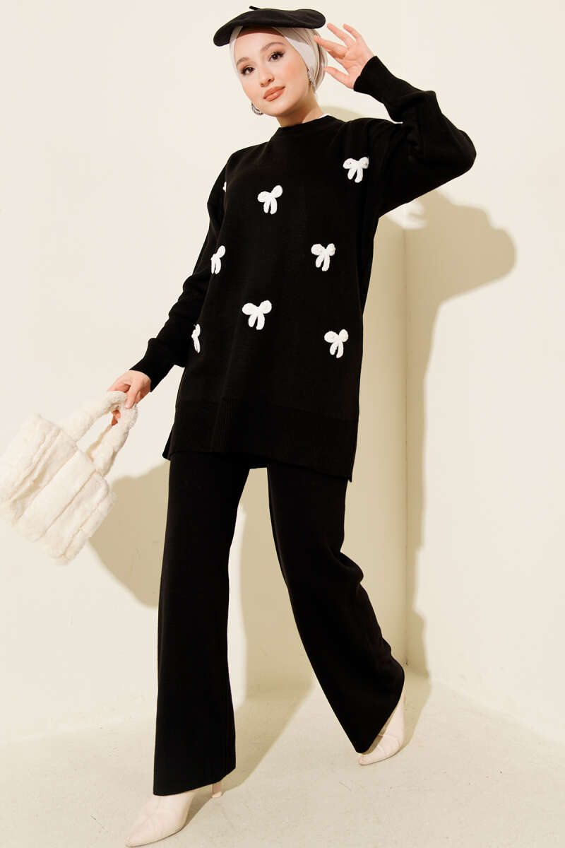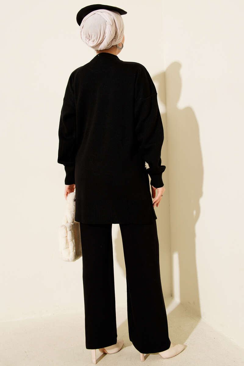 Şerit Detaylı Düğmeli Triko İkili Takım Siyah