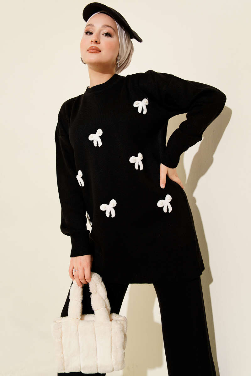 Fiyonk Desenli İncili Triko İkili Takım Kahve