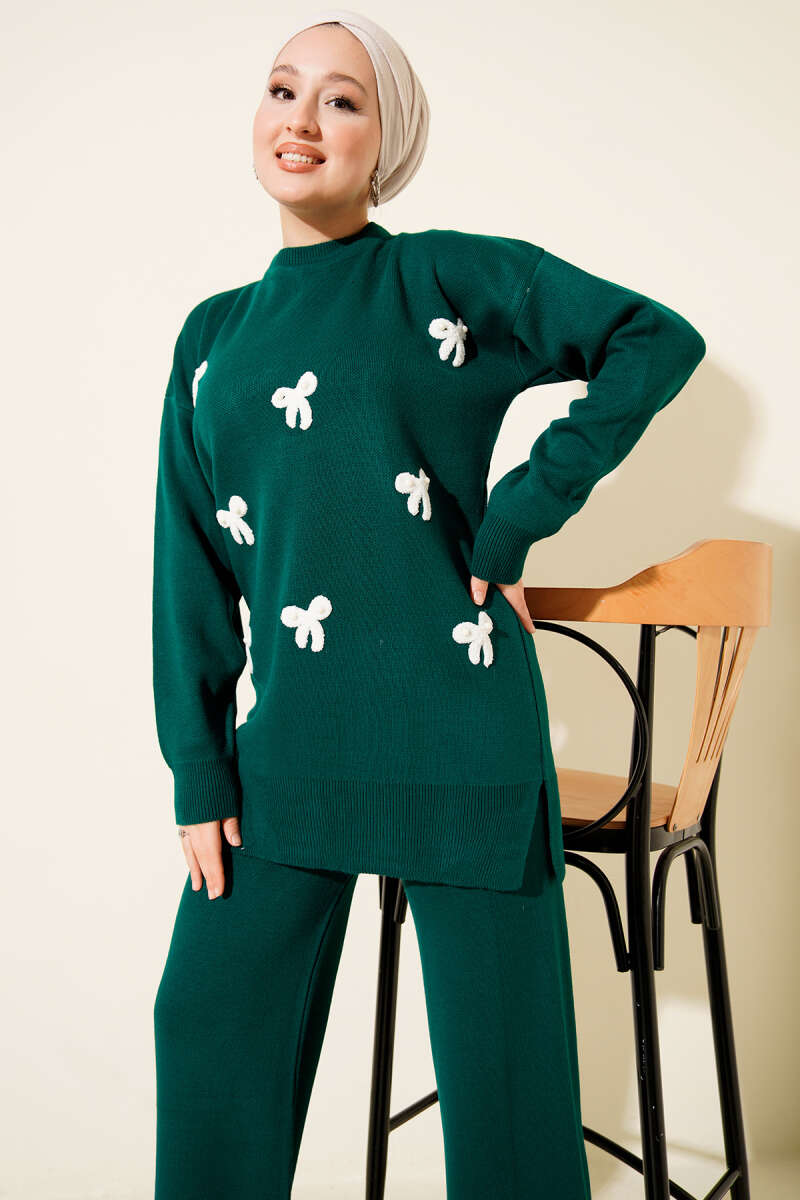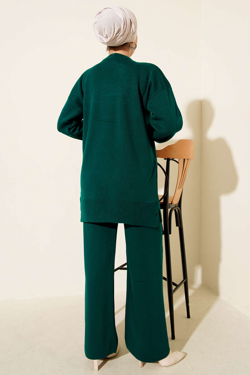 Şerit Detaylı Düğmeli Triko İkili Takım Zümrüt