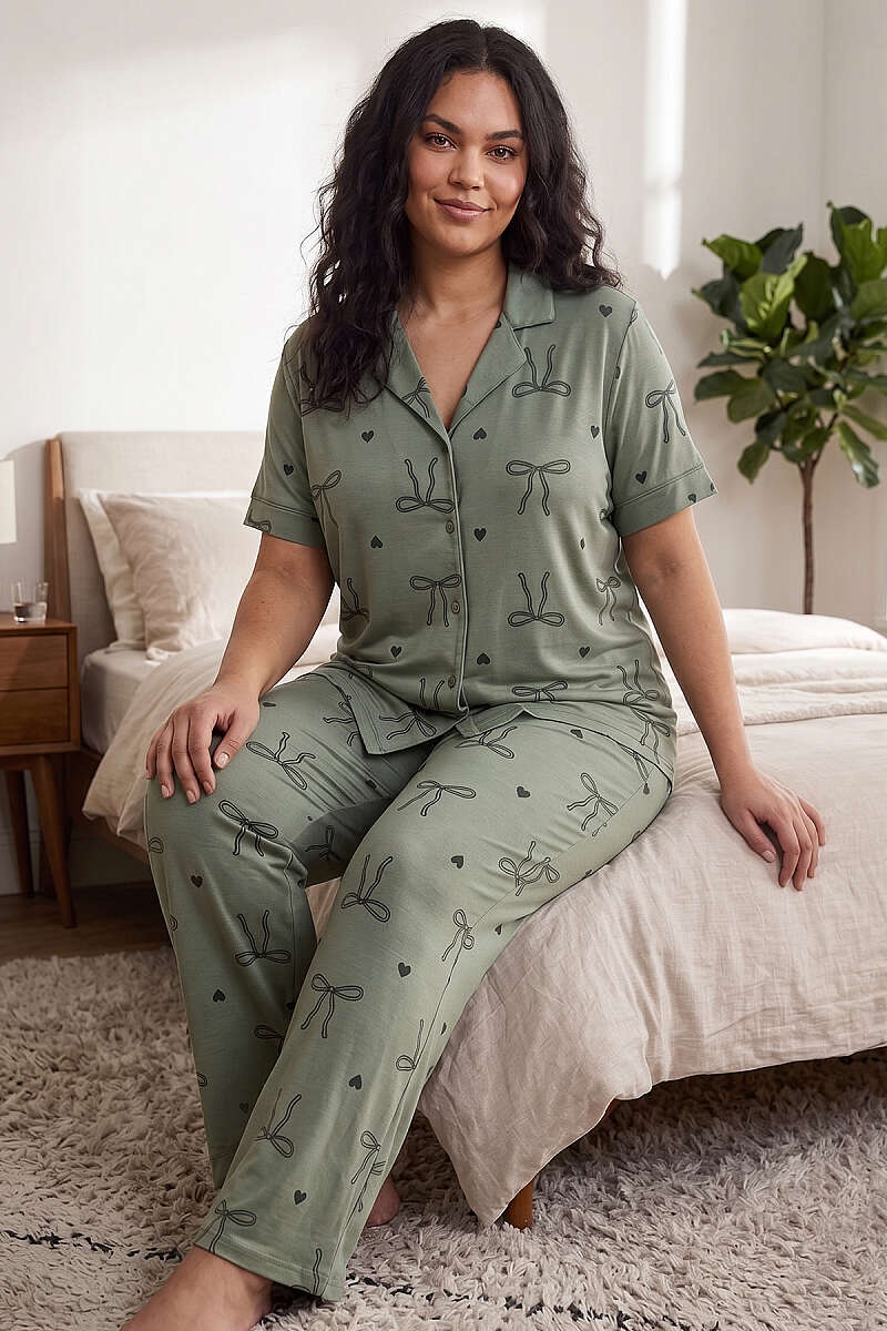 Fiyonk Detaylı Büyük Beden Kısa Kol Pijama Takımı Mint