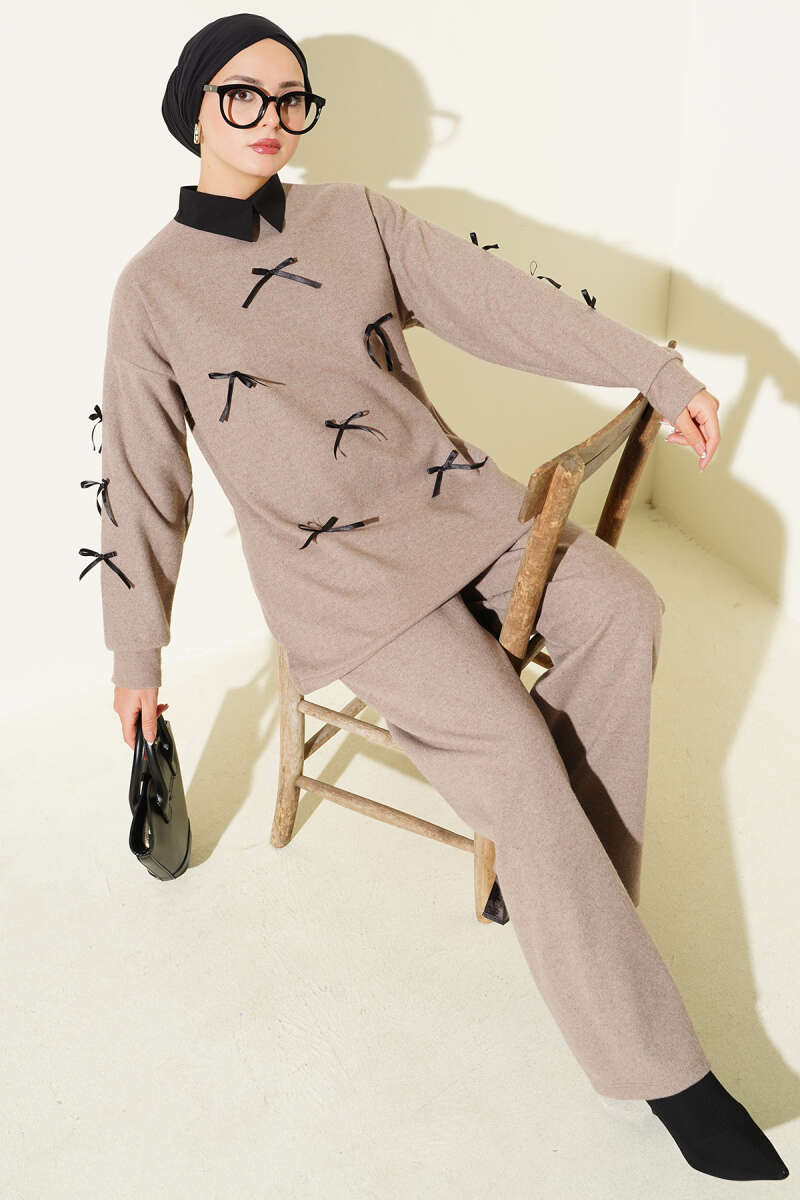 Yelekli Jile Elbise Triko İkili Takım Latte