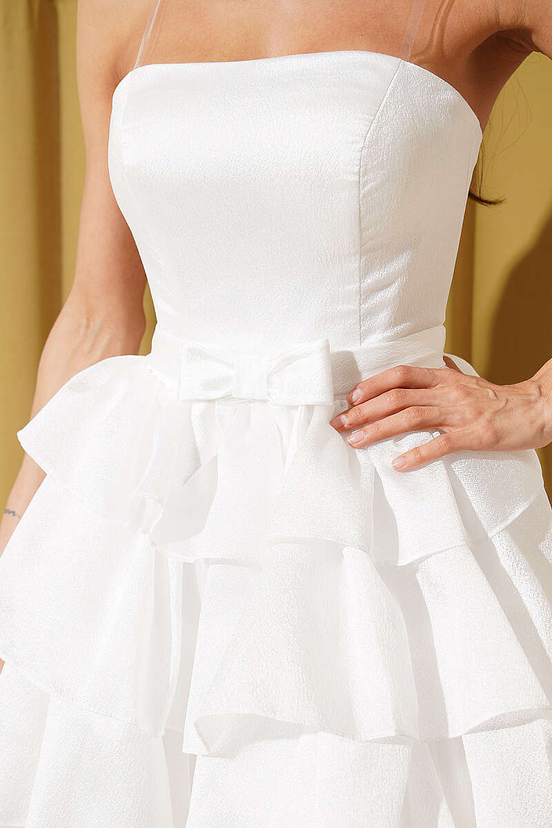 Straplez Yaka Şifon Abiye Elbise Ekru