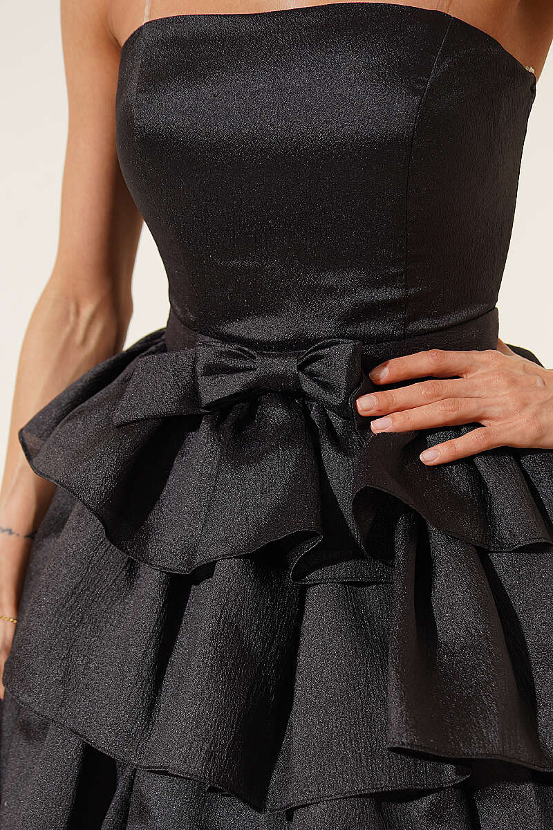 Straplez Yaka Şifon Abiye Elbise Siyah