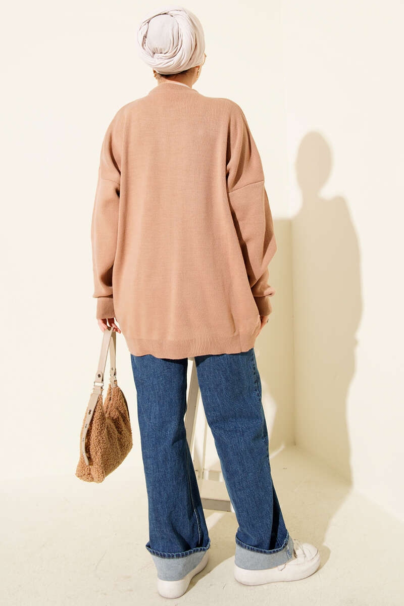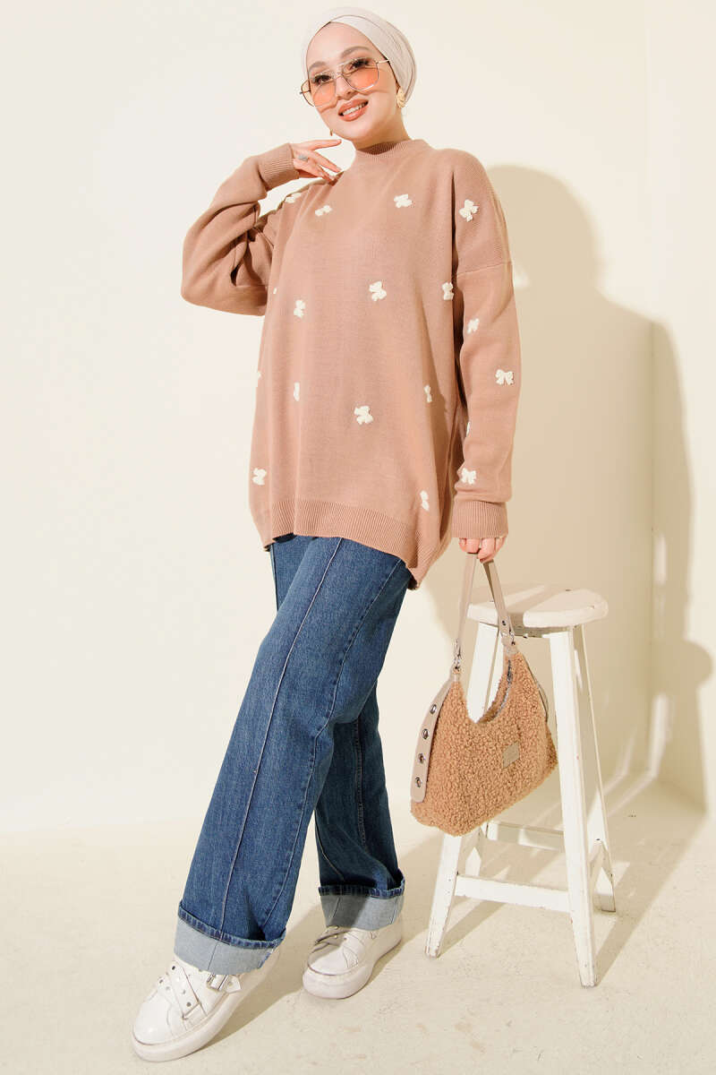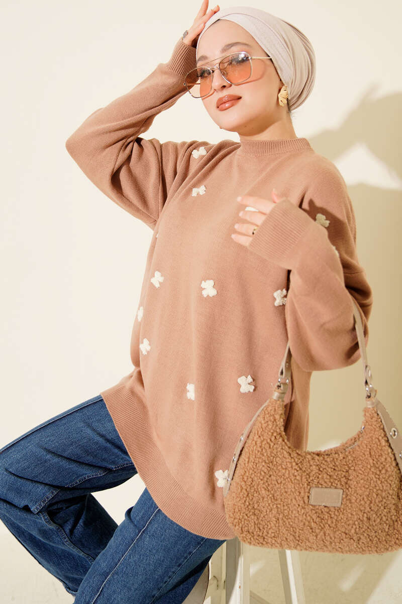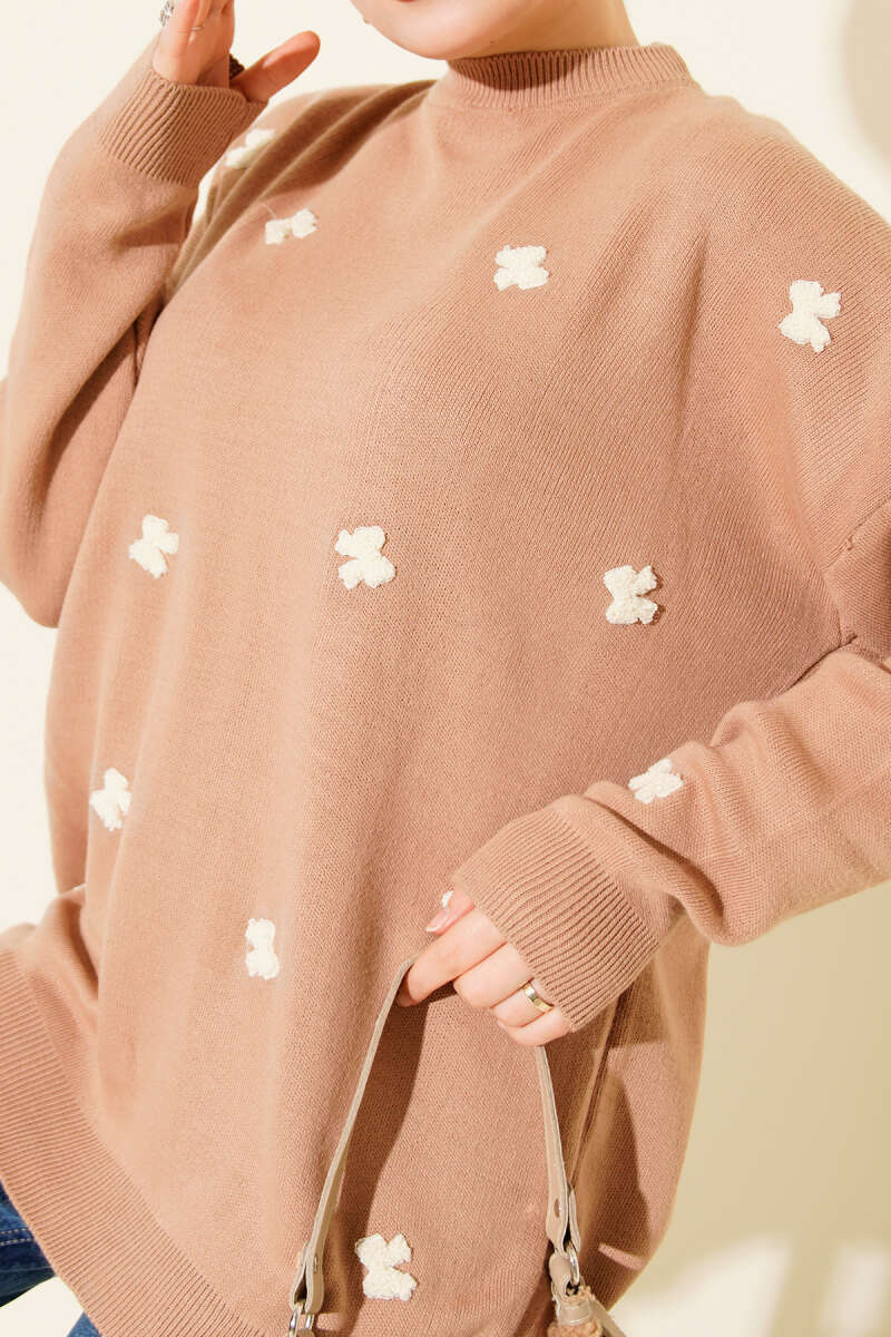 Fiyonk İşlemeli Triko Kazak Latte