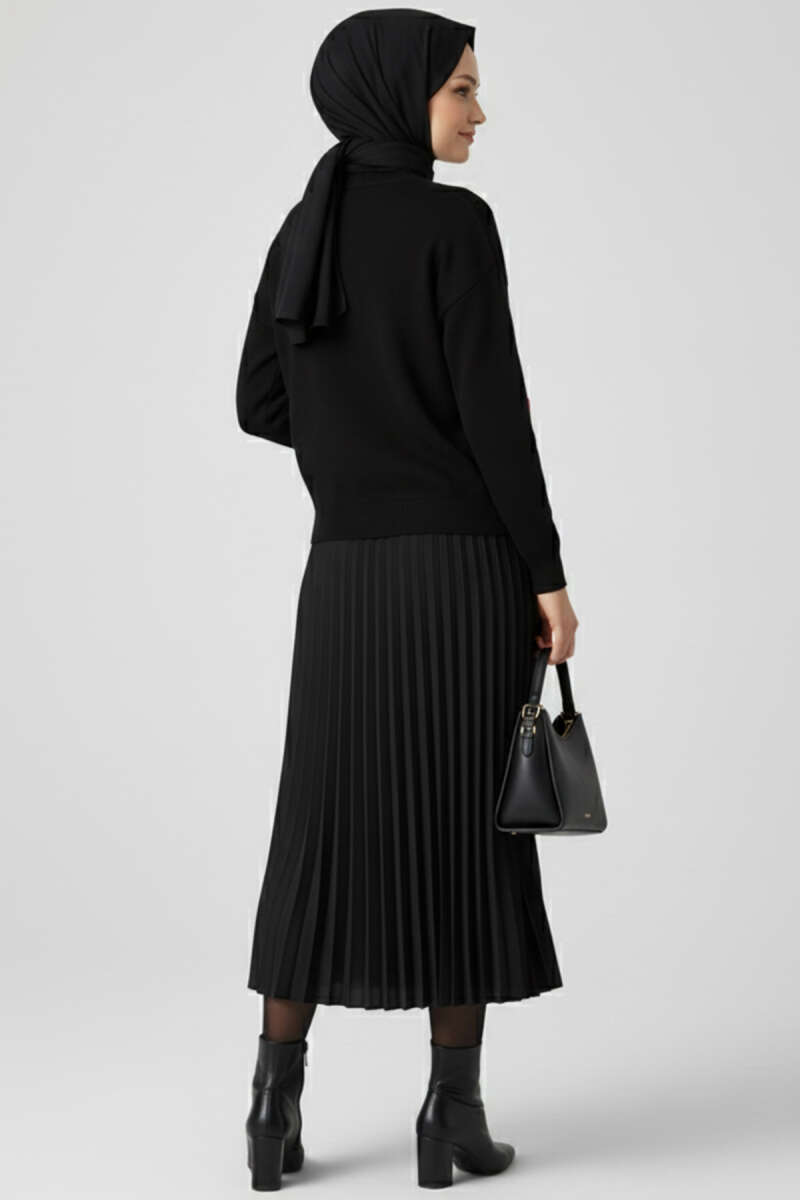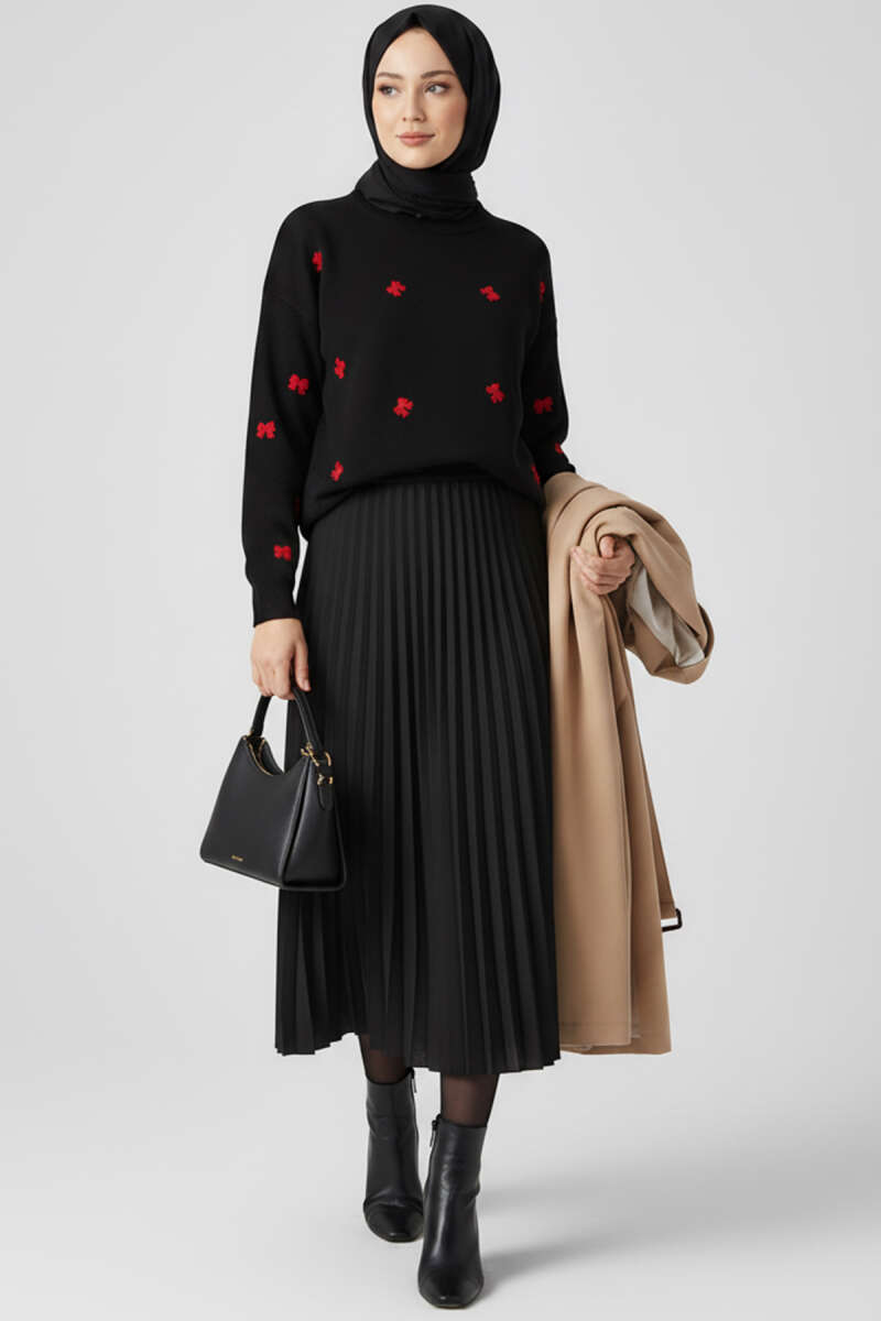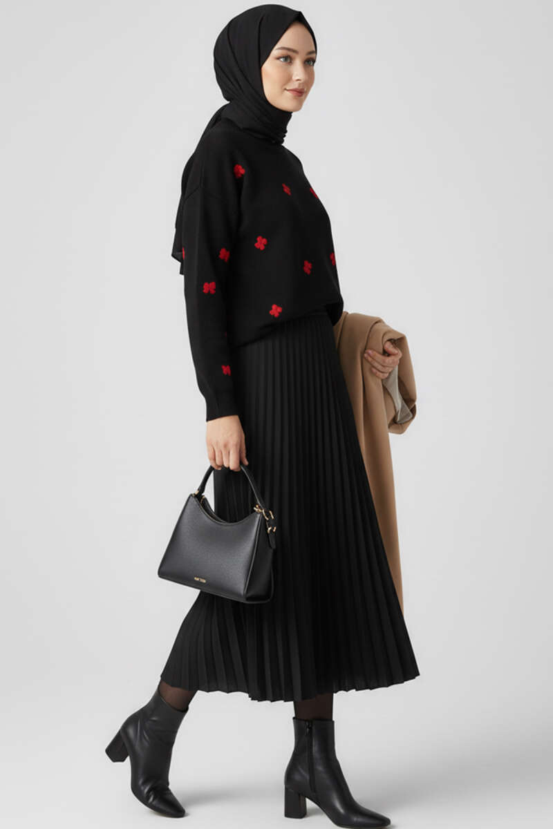 Çiçek İşlemeli Triko Kazak Siyah