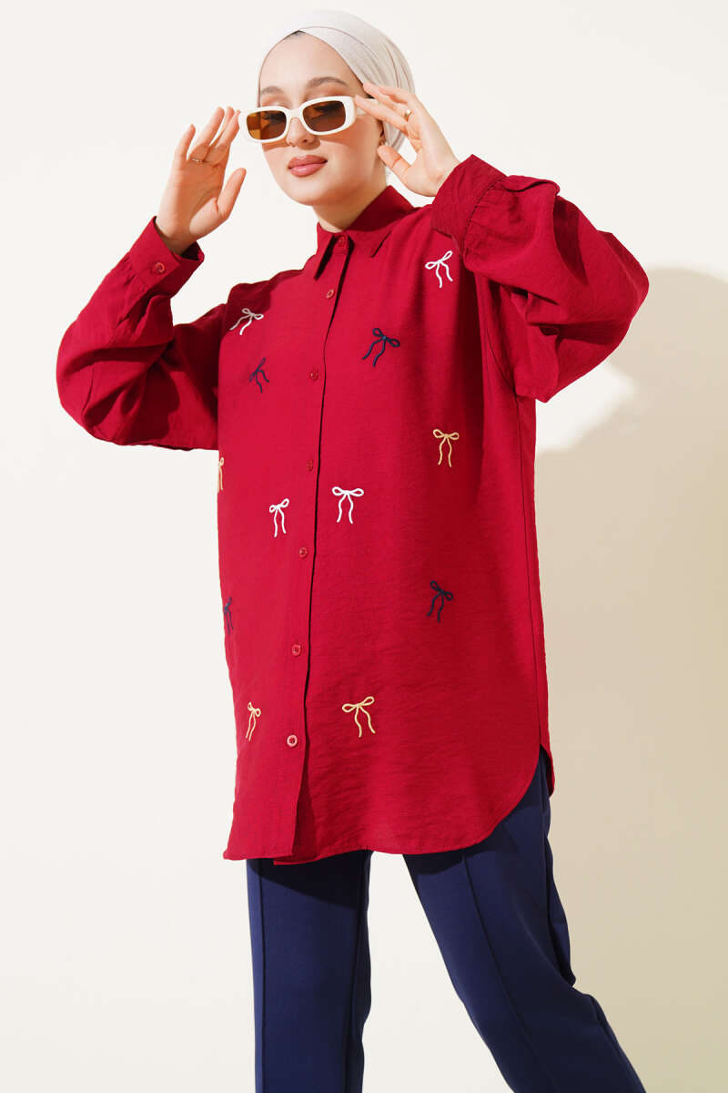 Yaka Bağlamalı Saten Gömlek Kırmızı