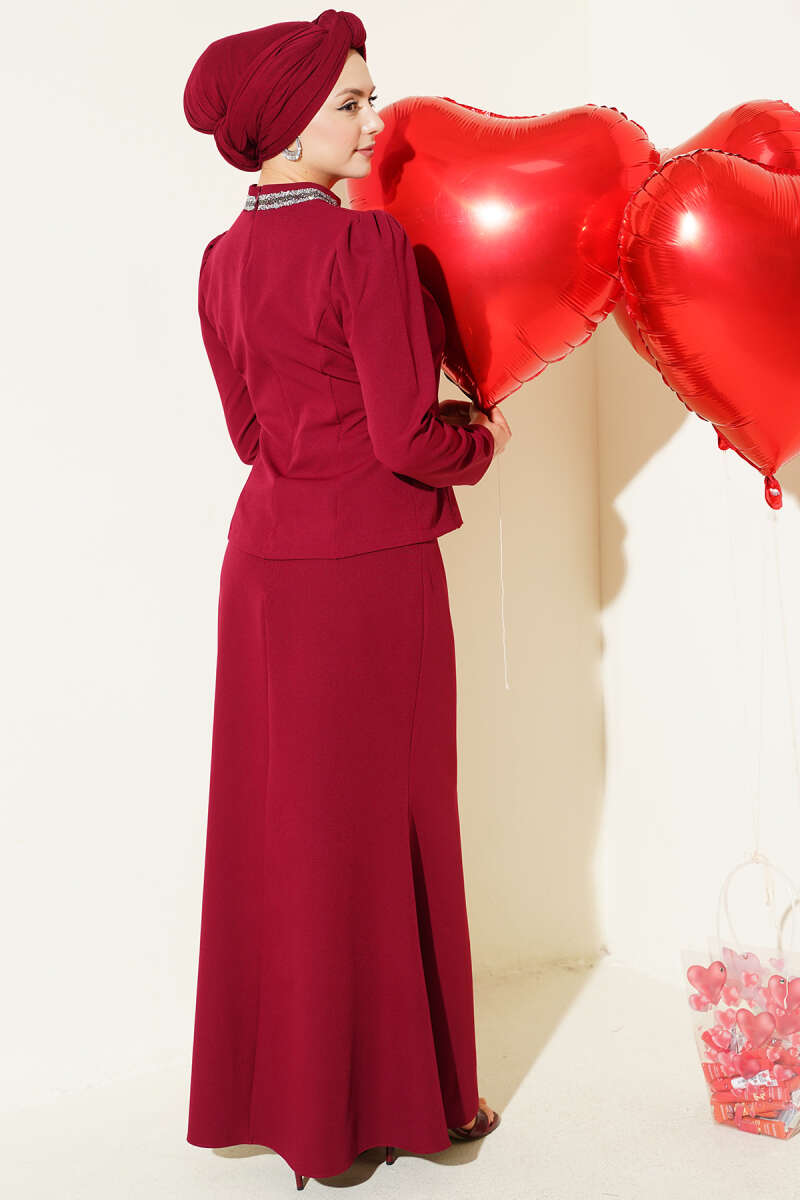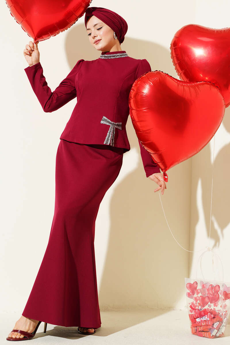 Fiyonk Taş Süslemeli Etekli İkili Takım Bordo
