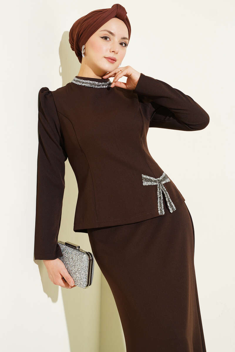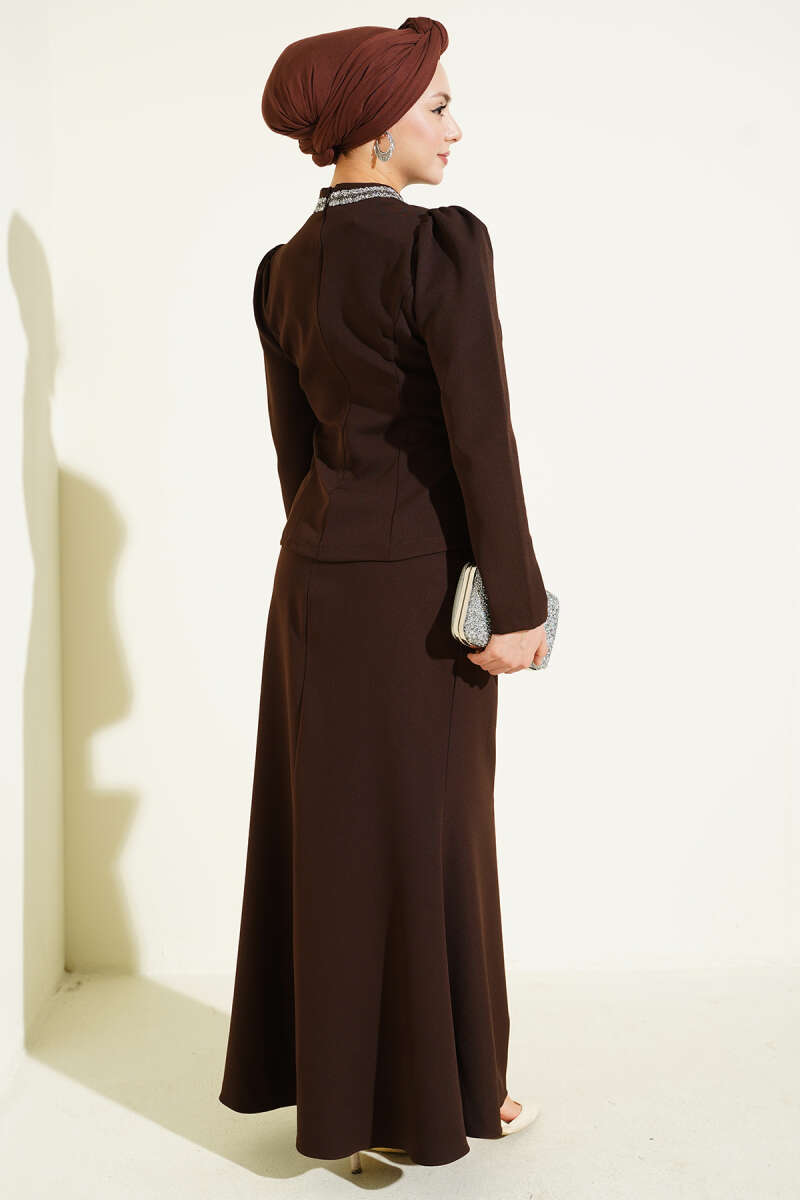 Fiyonk Taş Süslemeli Etekli İkili Takım Kahve