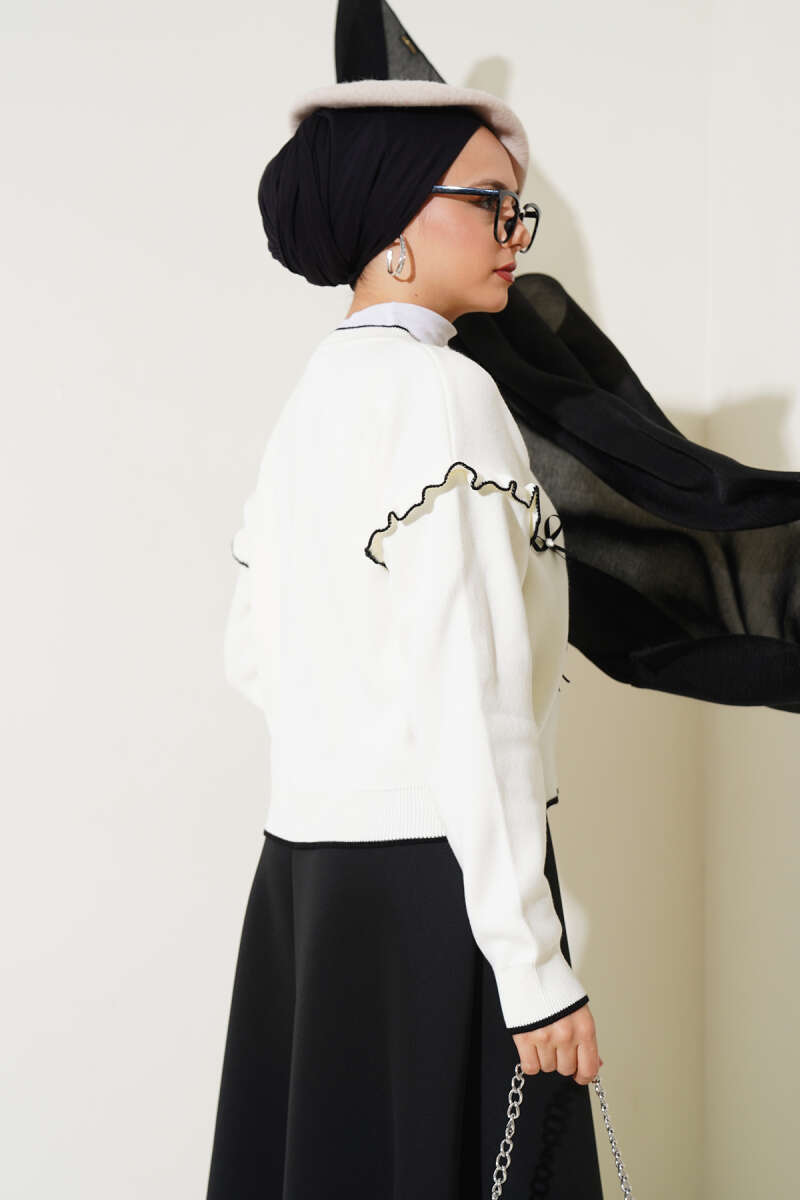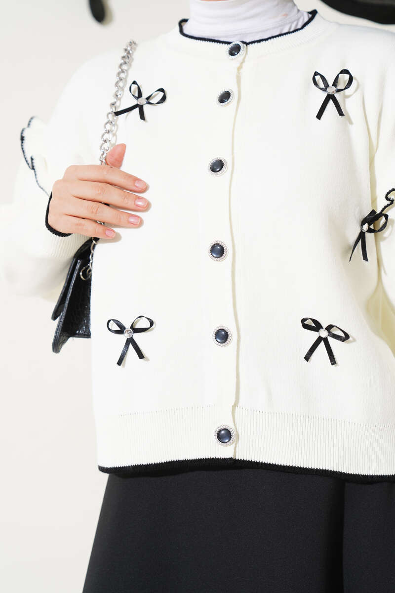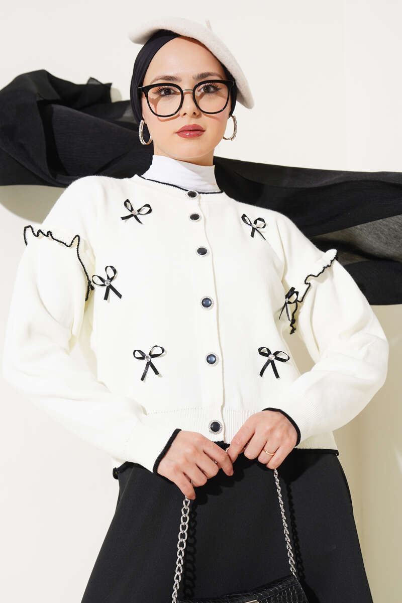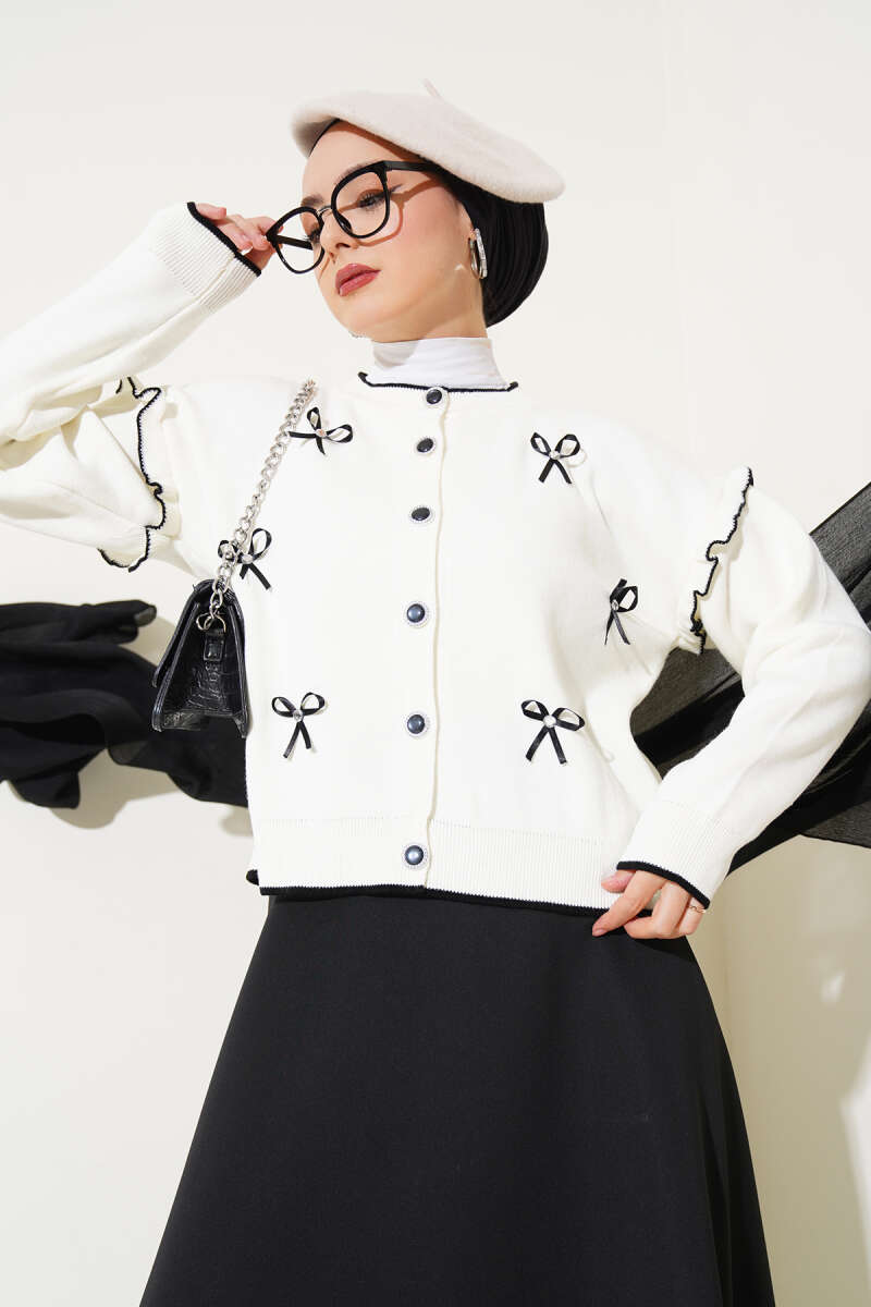 Fiyonklu Fırfırlı Kısa Triko Hırka Beyaz