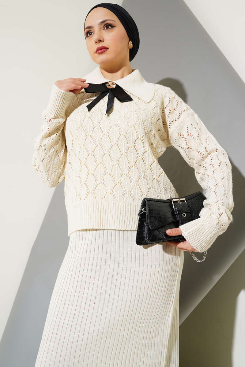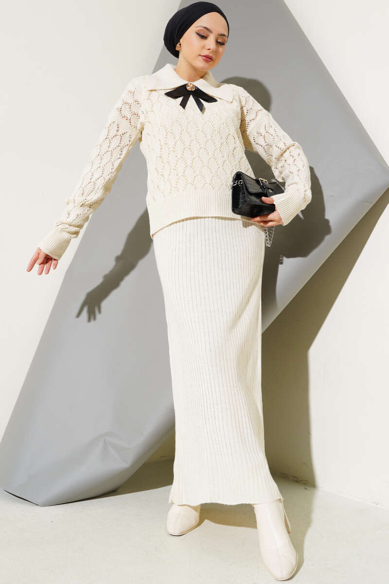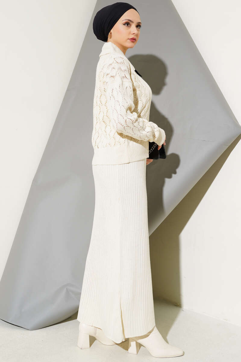 Balıkçı Yaka Fitilli Triko İkili Takım Ekru