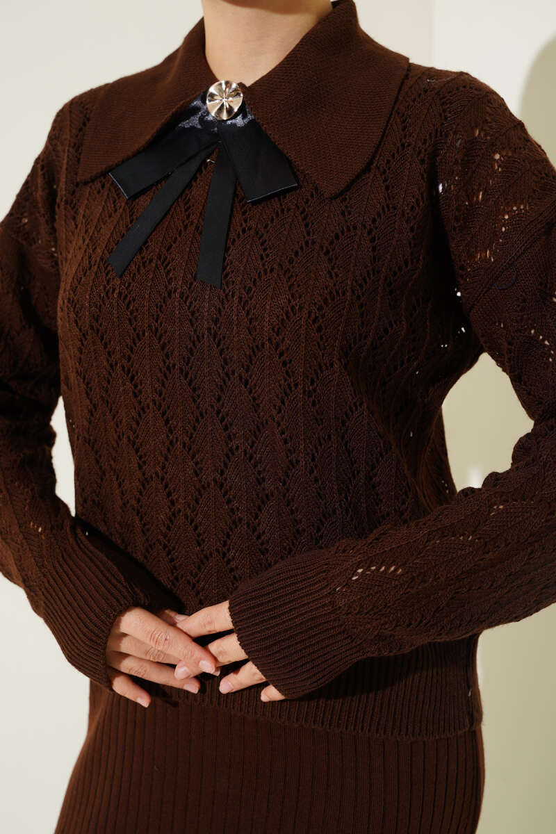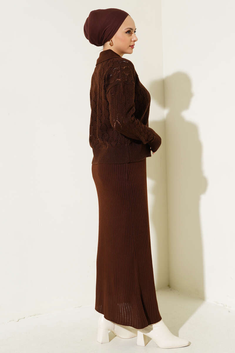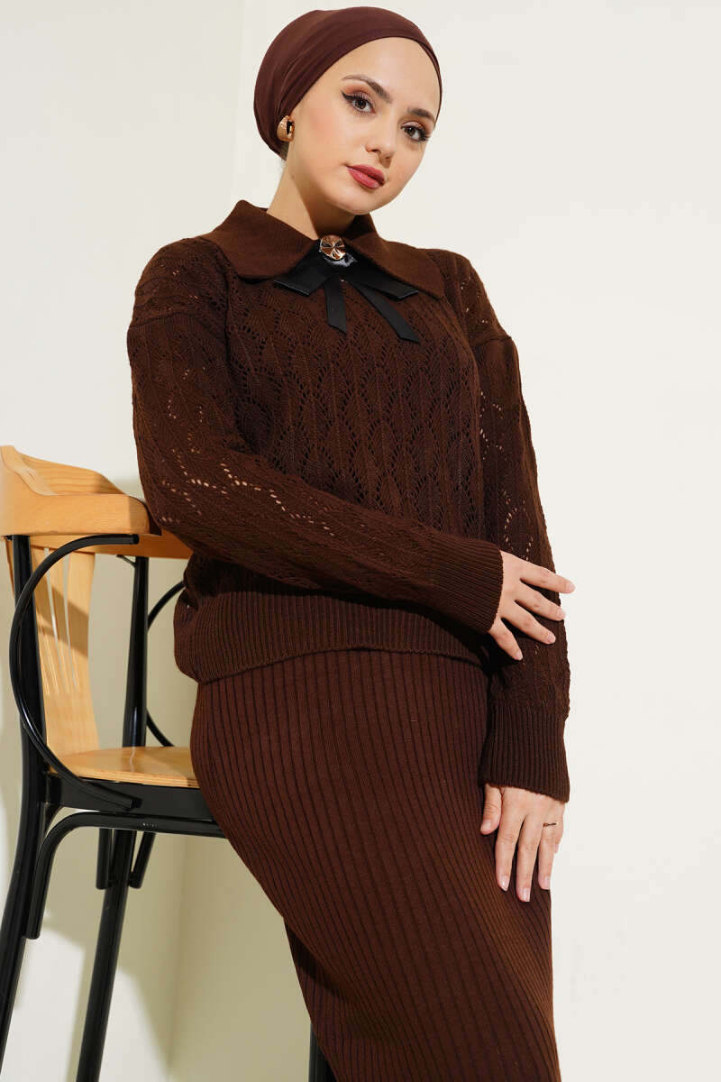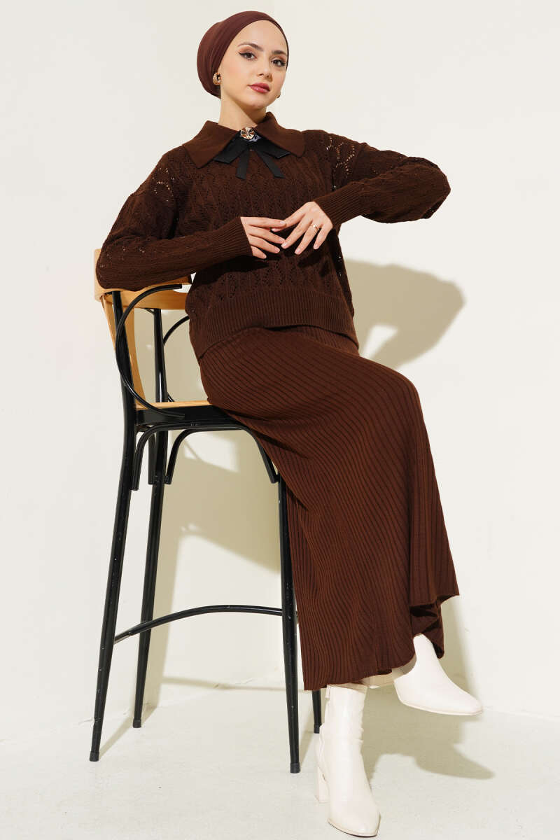 Taşlı Baklava Desen Triko İkili Takım Kahve