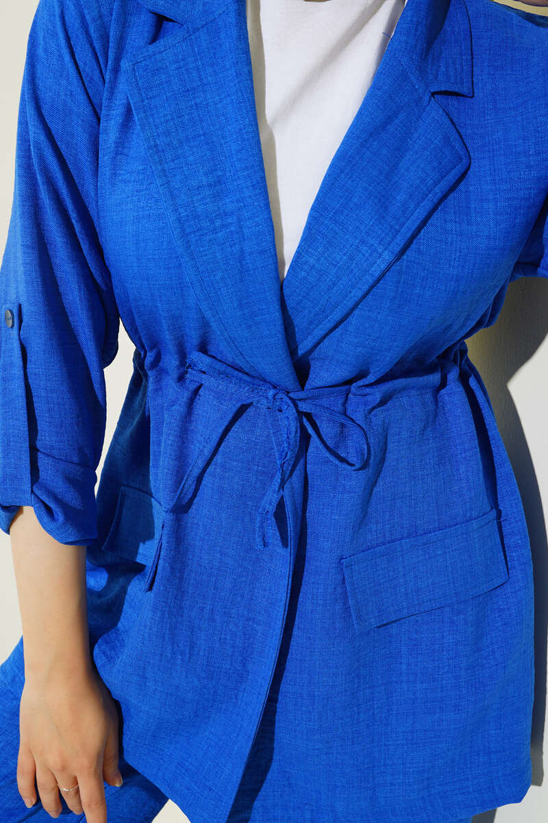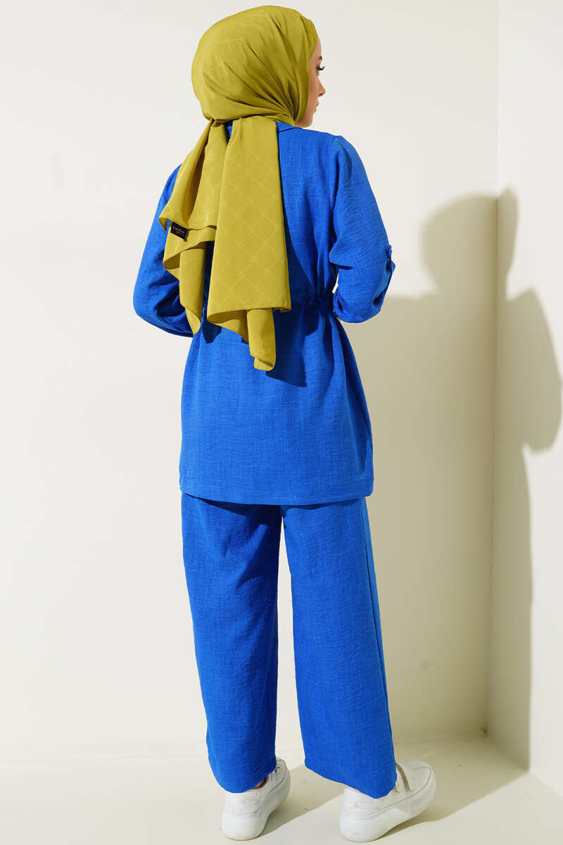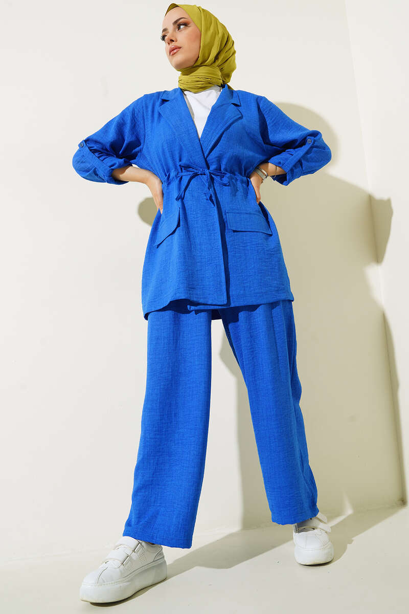Yeni sezon flamlı ikili takımımız farklı tarzıyla dikkat çekmektedir. Ceket ve pantolondan oluşan ikili takımımızın ceketi kruvaze yaka görünümülüdür.  İki adet kapaklı süsü cebi vardır. Beli büzgü ip bağlamalıdır. İkili takımımızın pantolonu arkadan bel lastiklidir. Cepsiz model olan pantolonumuz bol paçadır ve pens detaylıdır. Farklı renk seçenekleri mevcuttur.