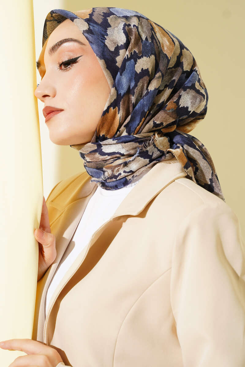 Flamlı Ebruli Desenli Eşarp Lacivert Bej