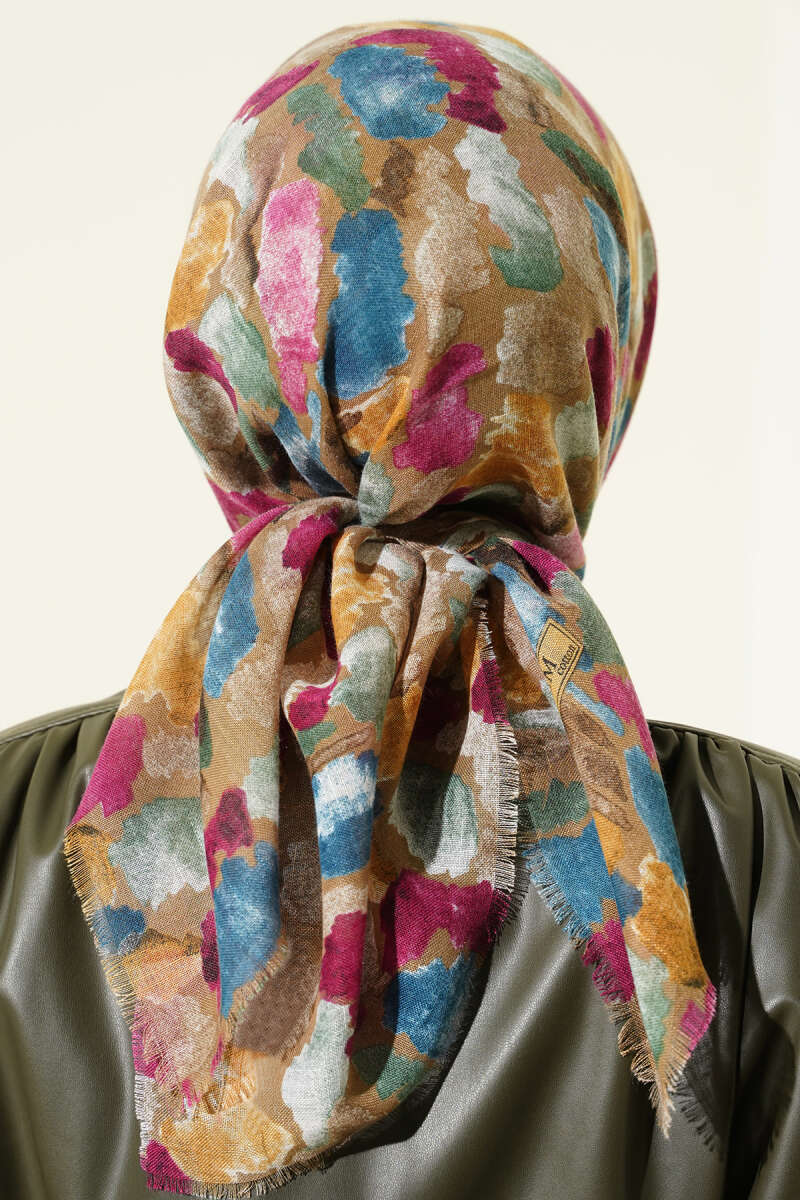 Flamlı Ebruli Desenli Eşarp Lacivert Bej