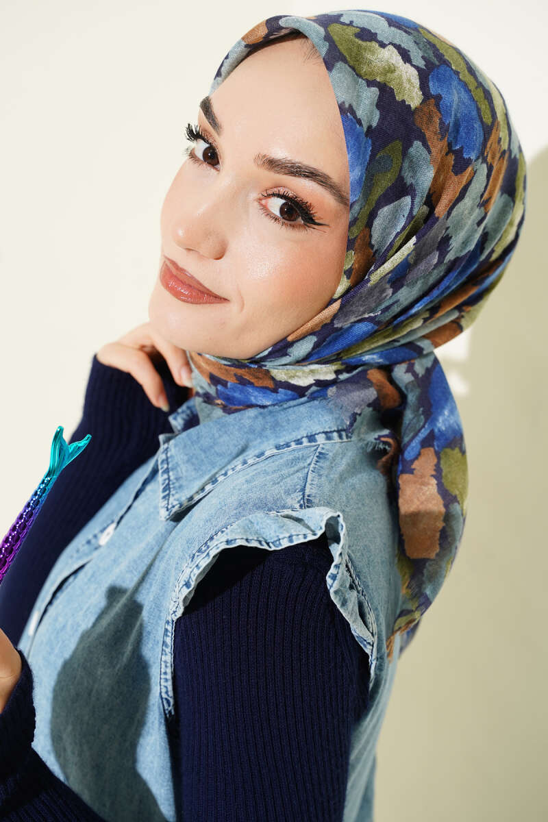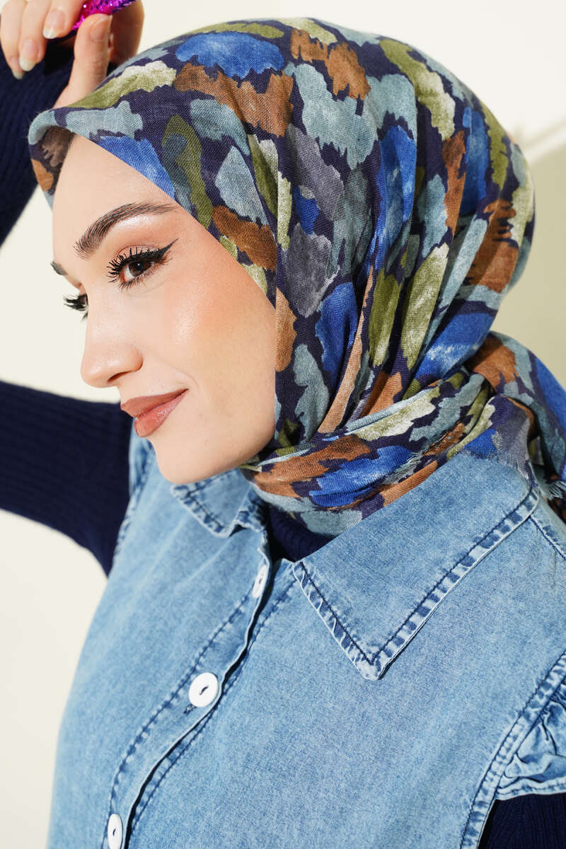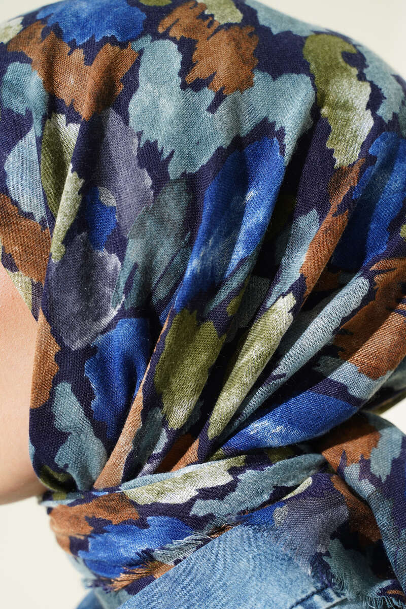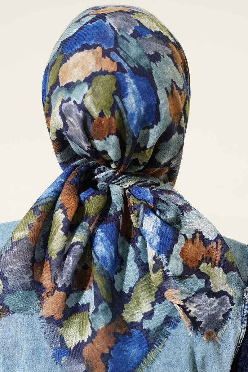 Flamlı Ebruli Desenli Eşarp Lacivert Bej