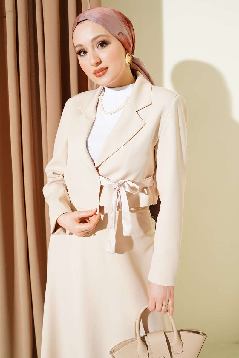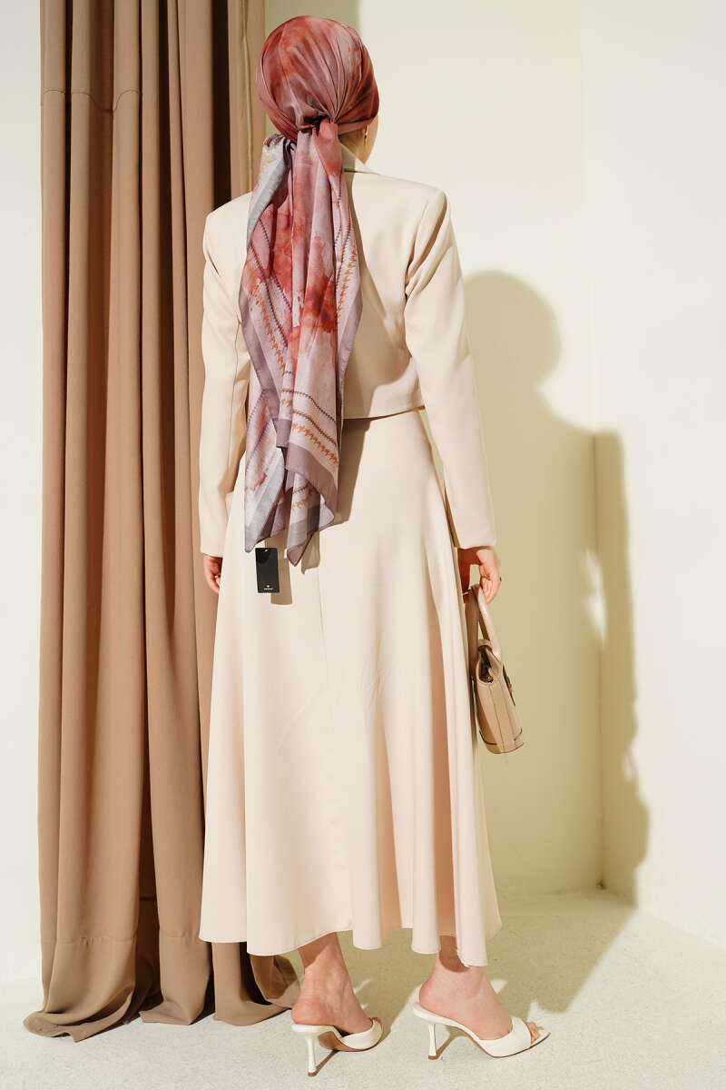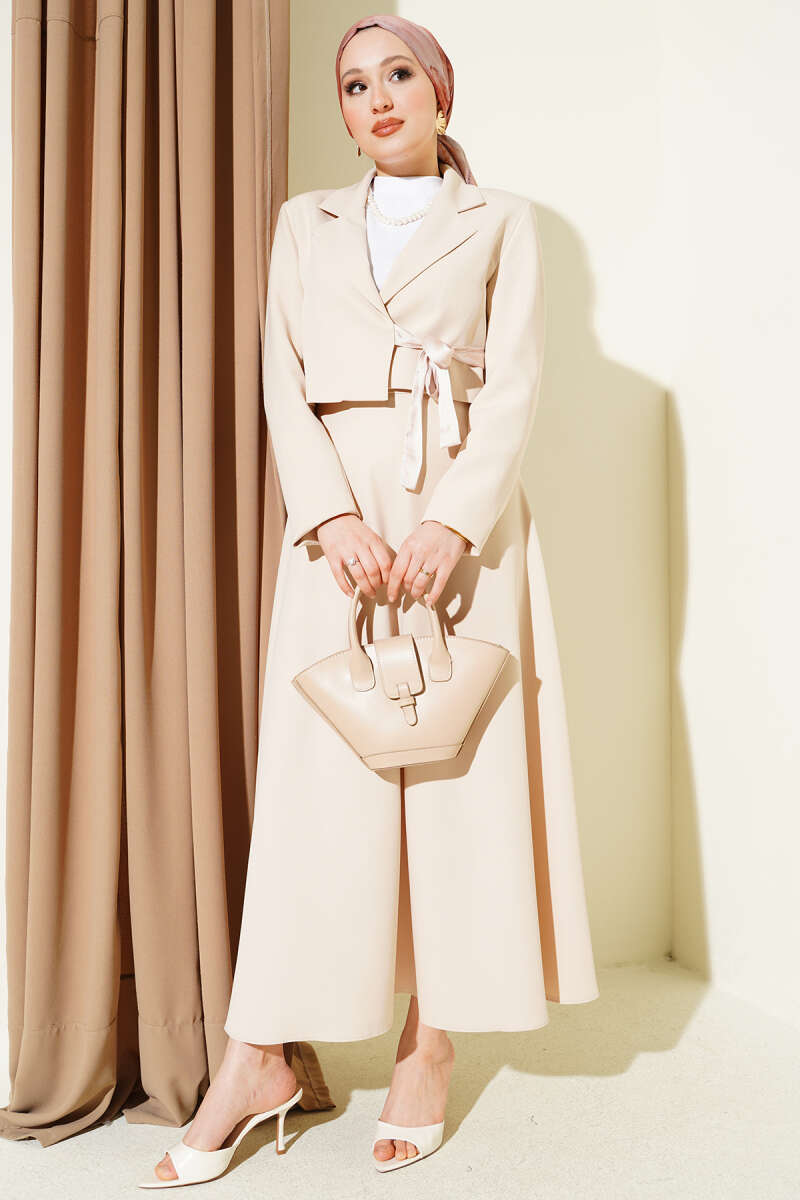 Ekoseli Yaka Bağlamalı Etekli Takım Bej