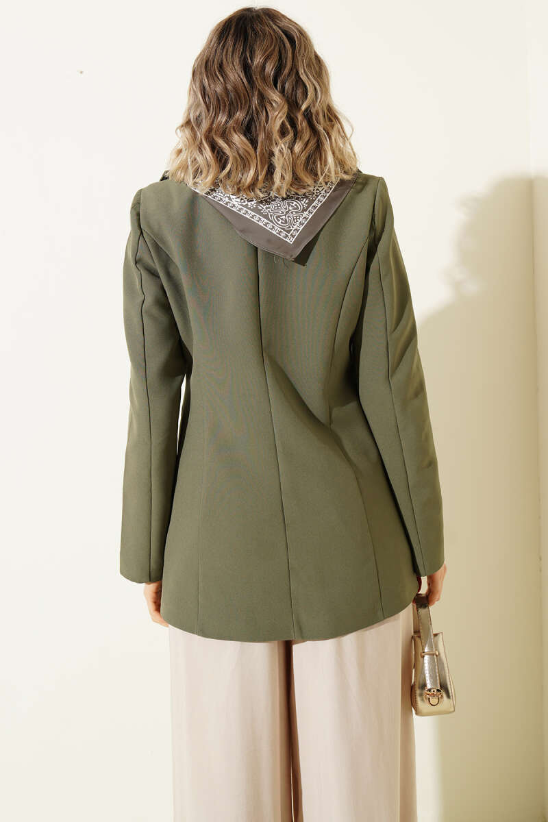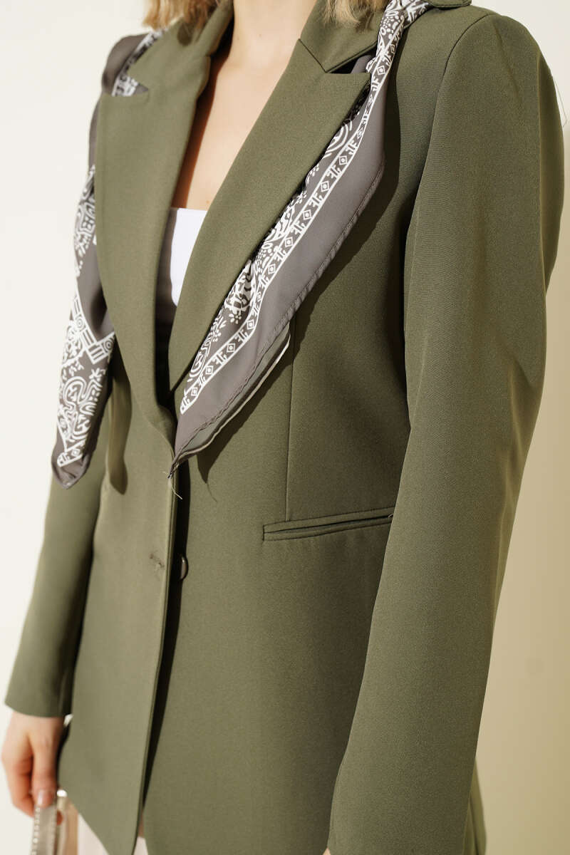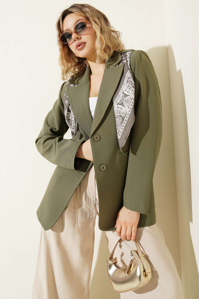 Maskülen hatları zarif detaylarla birleştiren bu ceket, yaka kısmındaki desenli eşarp eklentisiyle stilinize sofistike bir hava katıyor. Klasik blazer kesimi ve özenle yerleştirilmiş cep detayları, profesyonel bir görünüm sunarken modern kalıbı gün boyu konfor sağlıyor.