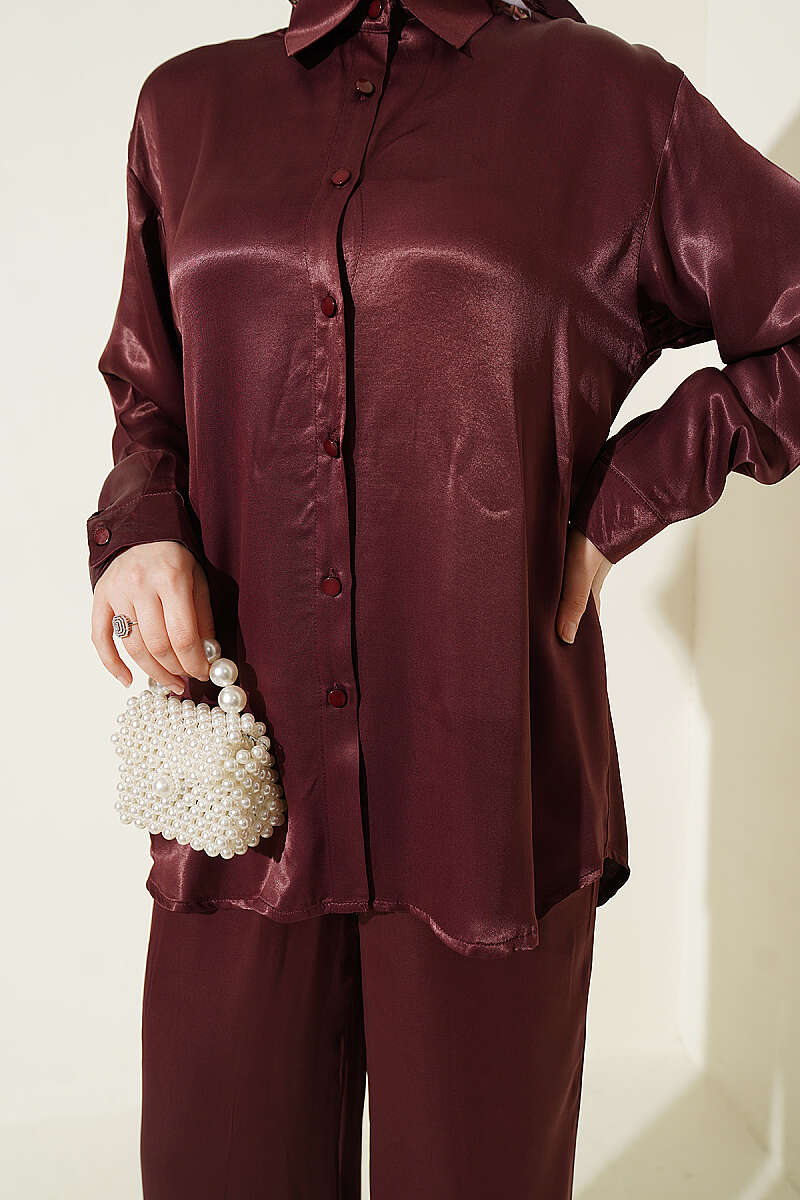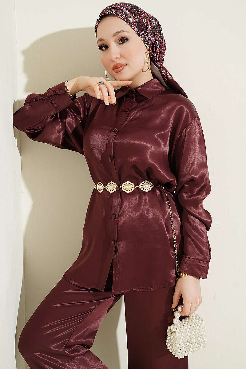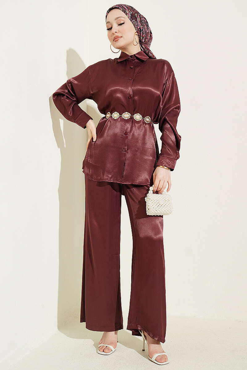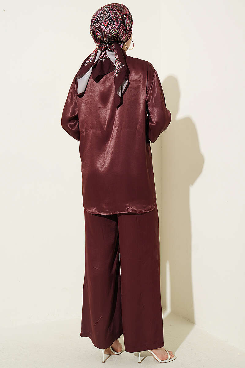 Lüks bir dokuya sahip olan bu saten ikili takım, kumaşının doğal parlaklığıyla zahmetsiz bir zarafet sergiler. Gömlek yaka tuniğin omuzlarına eşlik eden paisley desenli fular detayı, tasarıma sofistike ve hareketli bir hava katar. Geniş paça pantolonu ve akışkan kesimi sayesinde gün boyu konforlu bir kullanım sunan bu set, hem özel davetlerde hem de şık günlük kombinlerde fark yaratmak için idealdir.