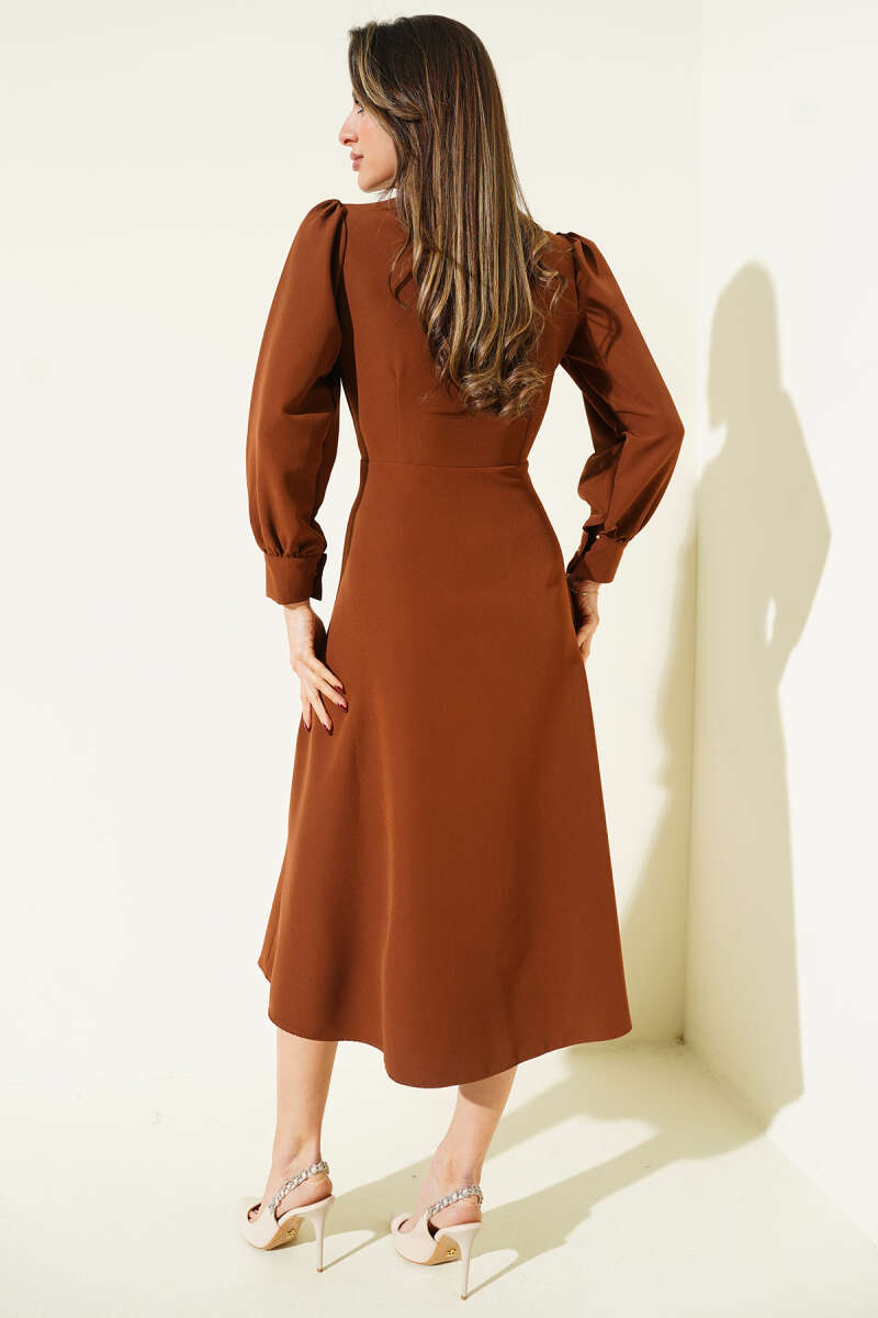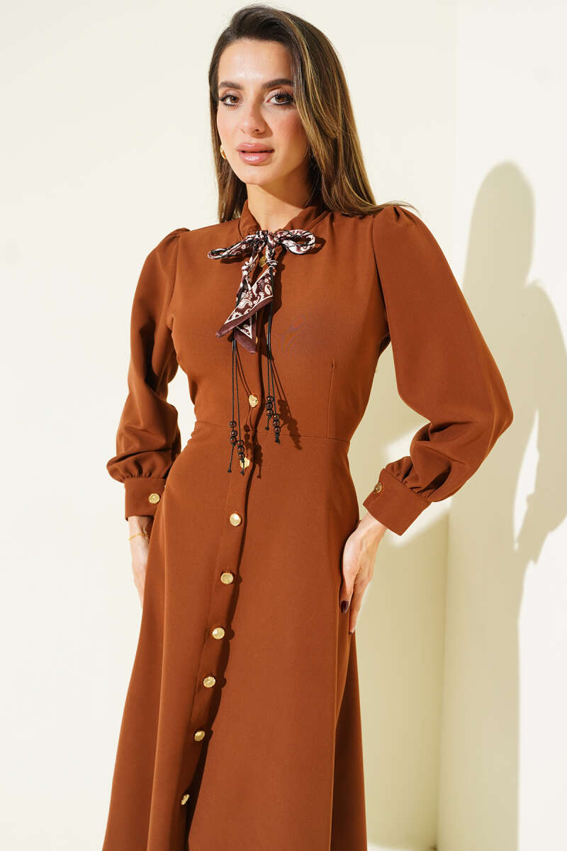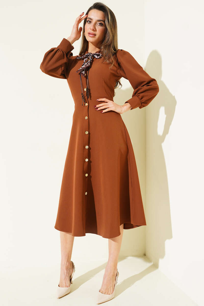 Fular Yakalı Boydan Düğmeli Midi Elbise Taba