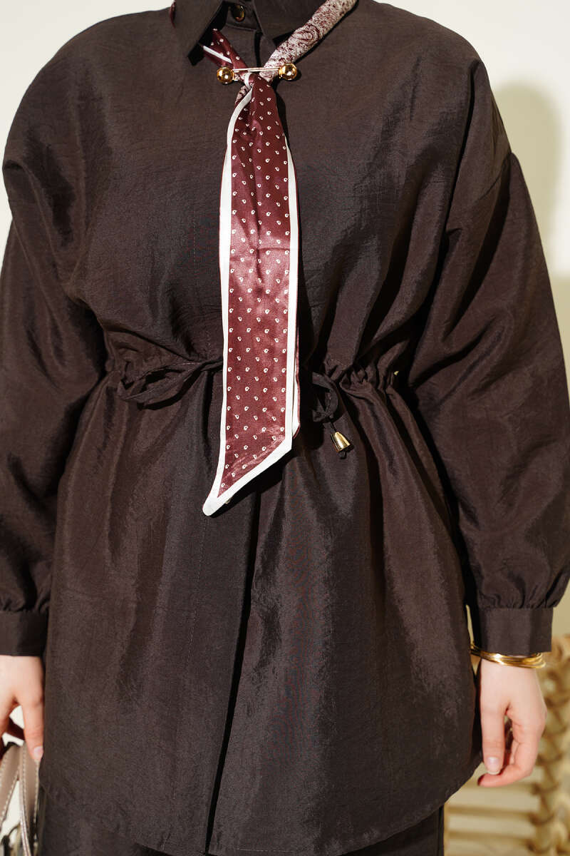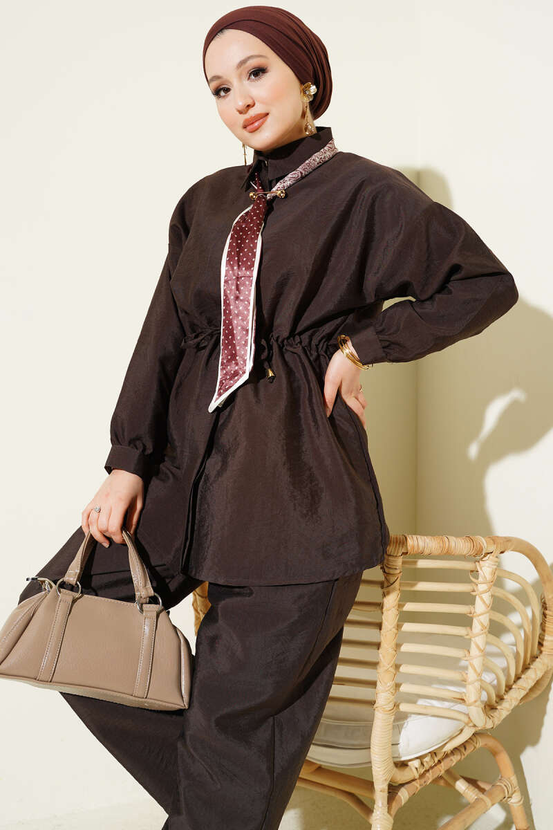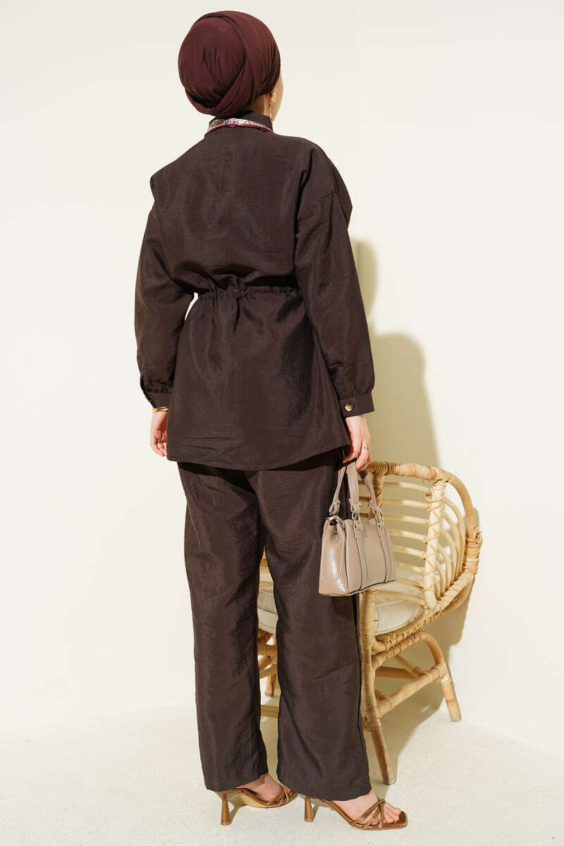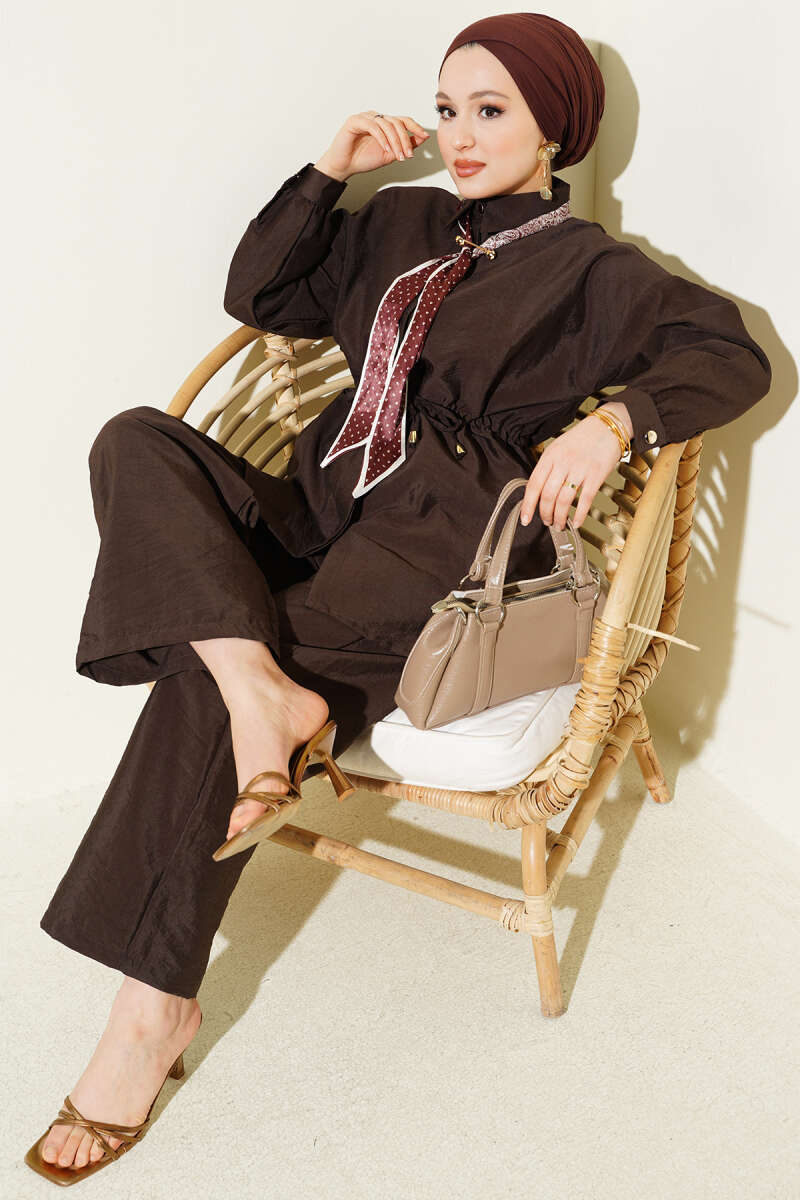 Modern paraşüt kumaş yapısıyla hem sportif hem de şık bir görünüm sunan bu ikili takım, hafif dokusu sayesinde gün boyu üstün bir konfor vadeder. Bel kısmındaki ayarlanabilir tünel bağcık detayı silüetinizi zarifçe vurgularken, takıma eşlik eden fular detayı tasarıma sofistike ve özgün bir hava katar. Rahat kesim pantolonu ve fermuarlı üst parçasıyla hareket özgürlüğünü destekleyen bu set, fonksiyonelliği modern şehir stiliyle birleştirir. Gardırobunuzun en dinamik parçalarından biri olmaya aday olan bu takım, çabasız şıklığı her ortamda üzerinizde taşımanıza olanak tanır.