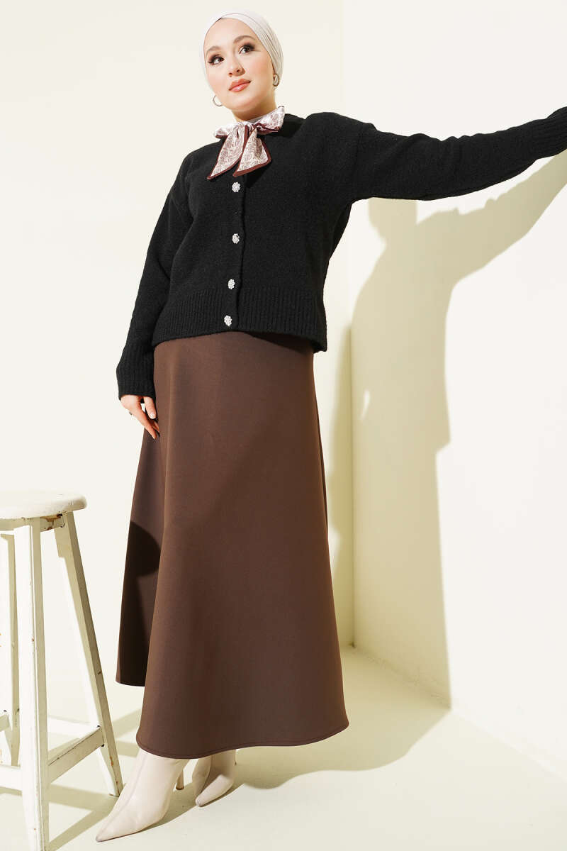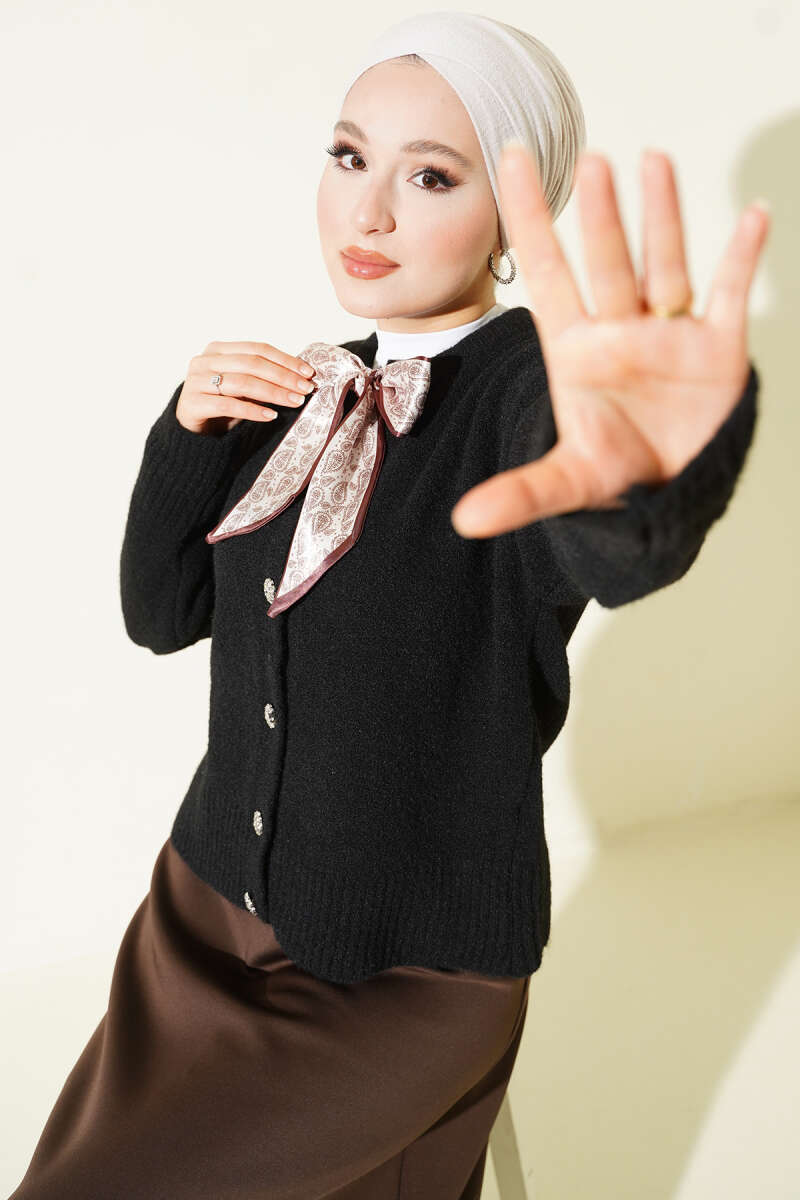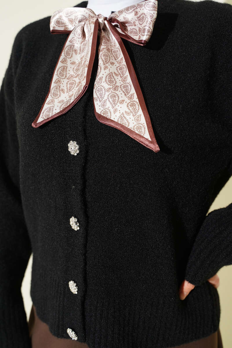 Fularlı Düğmeli Triko Hırka Mürdüm