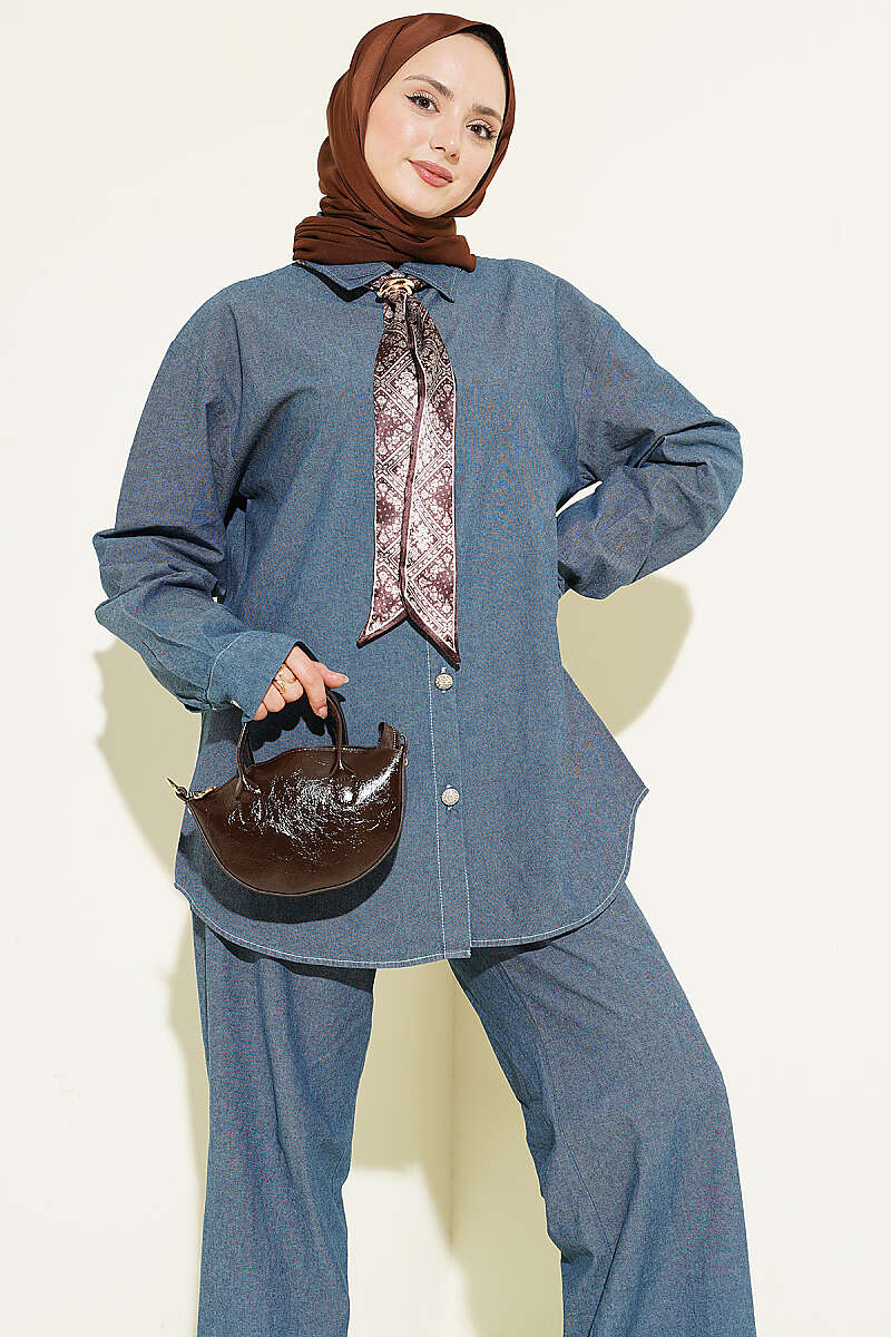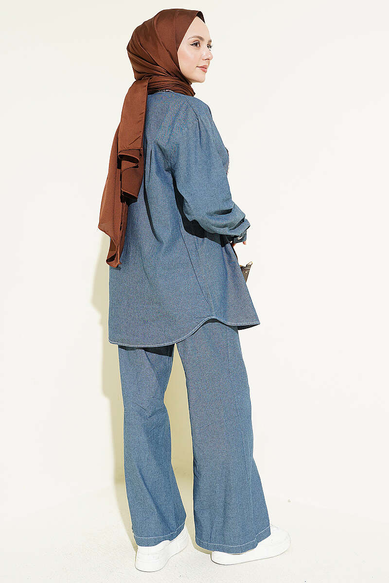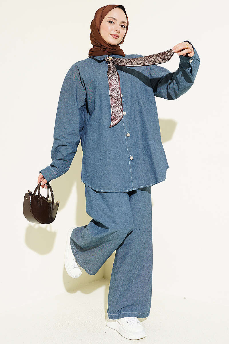Fularlı Taş Düğmeli Kot İkili Takım Kot