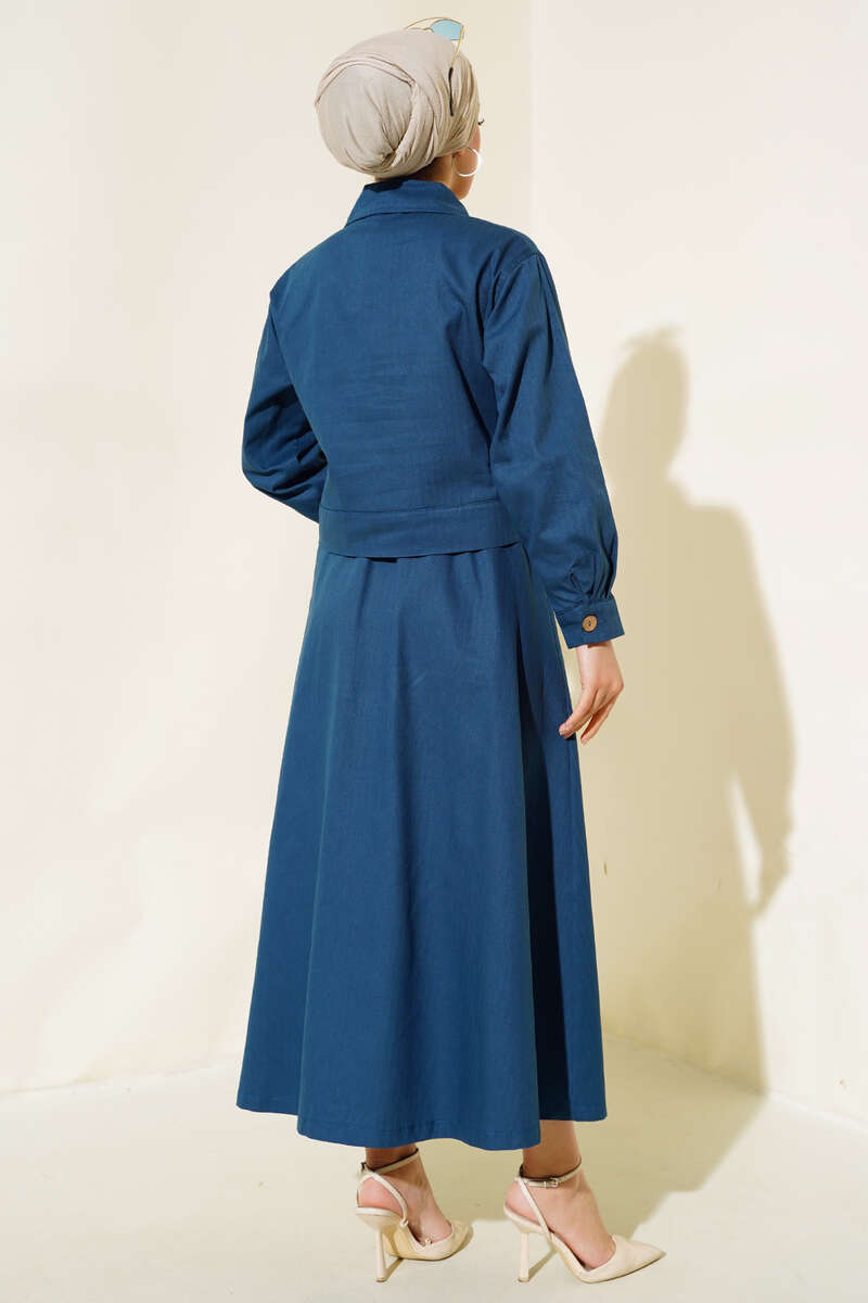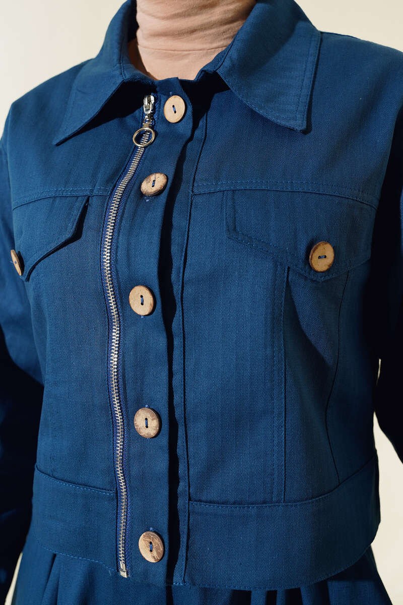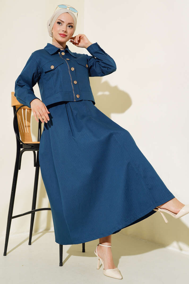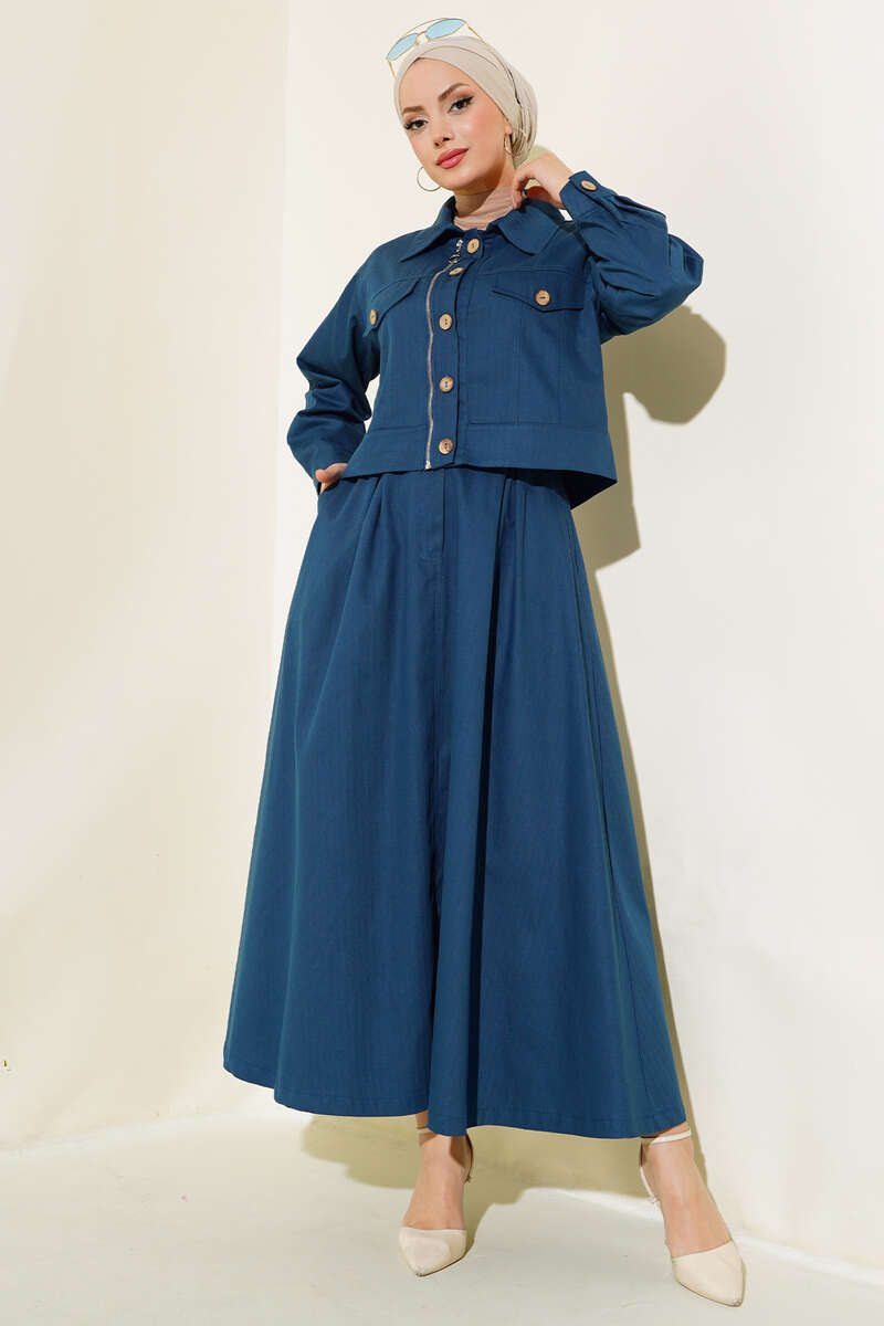 Yeni sezon ikili takım modelimiz sizlerledir. Kısa ceket modelimizin önü düğmelidir. İki adet düğmeli göğüs cebi kapağı bulunmaktadır. Kol bilekleri düğmelidir. Önden fermuar detaylıdır. Eteğimizin beli lastiklidir. İki adet kemer köprüsü bulunmaktadır. Önden fermuar ve düğmelidir. Kloş modeldir. Gabardin kumaş ikili etek takım modelimizin renk seçenekleri mevcuttur.