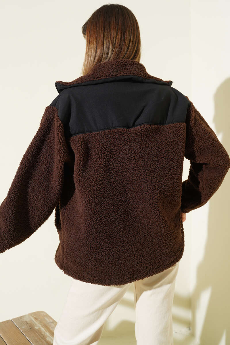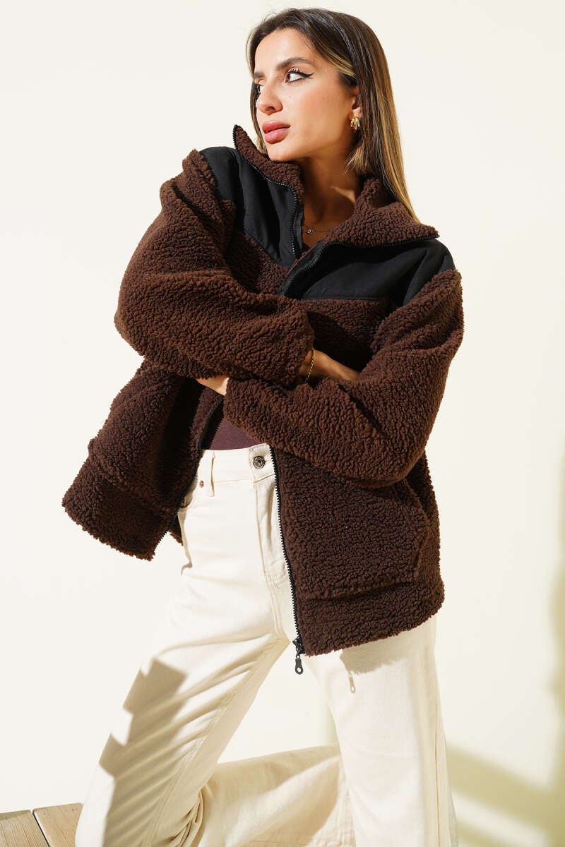 Garni Detaylı Fermuarlı Peluş Mont Kahve
