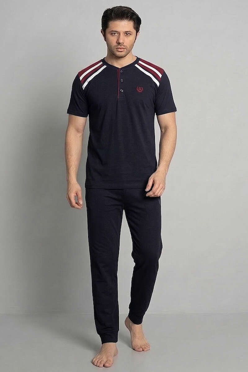 Garnili Düğmeli Kısa Kol Erkek Pijama Takımı Lacivert Bordo