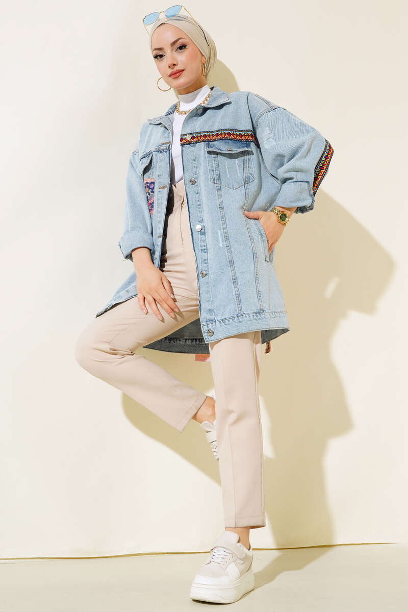 Yeni sezon kot ceketimiz sırt kısmı garnili olup hareketlilik kazandırmıştır. Ceketimizin göğsünde iki adet olmak üzere, dört adet cepi bulunmaktadır. Ceketimizde nakış detayları bulunmaktadır. Kot ceketimiz kombinlerinizin vazgeçilmez parçası olacaktır.
