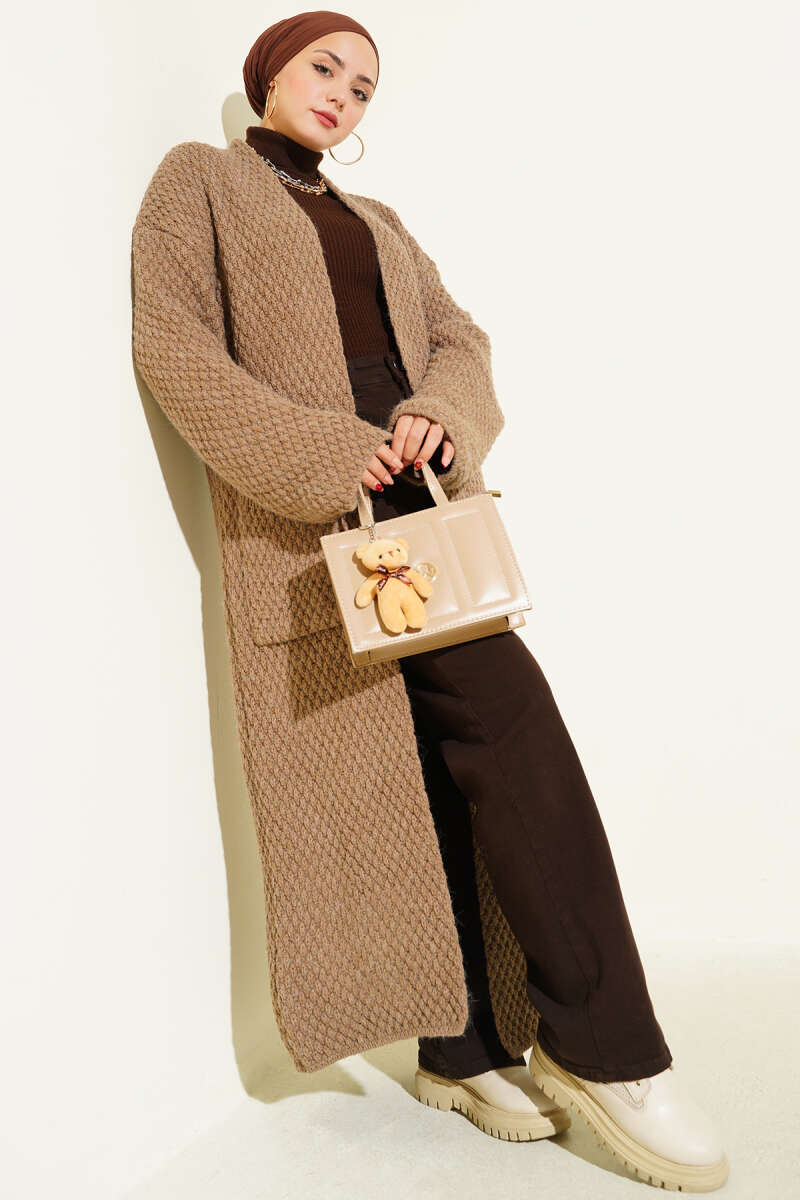 Saç Örgülü Düğmeli Triko Hırka Bej