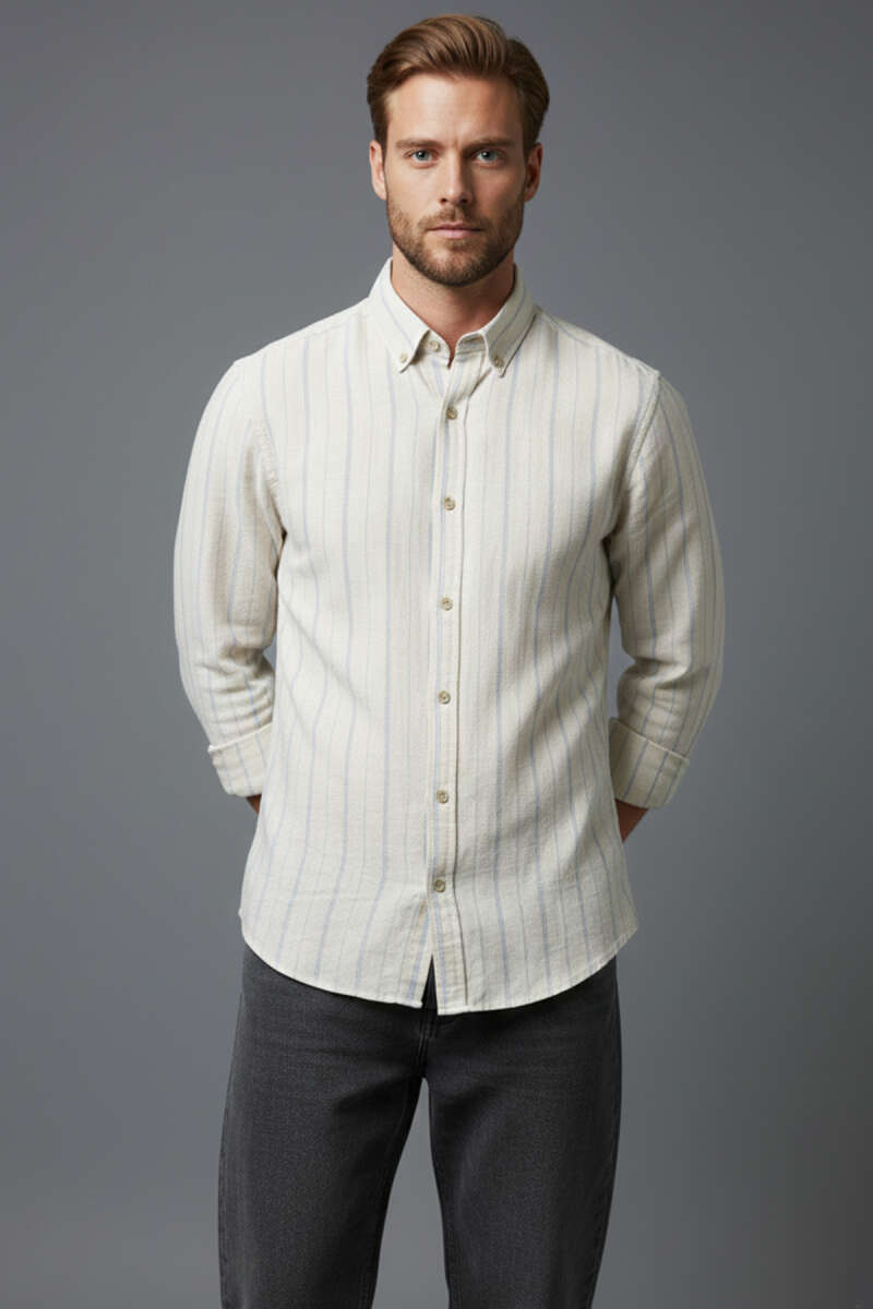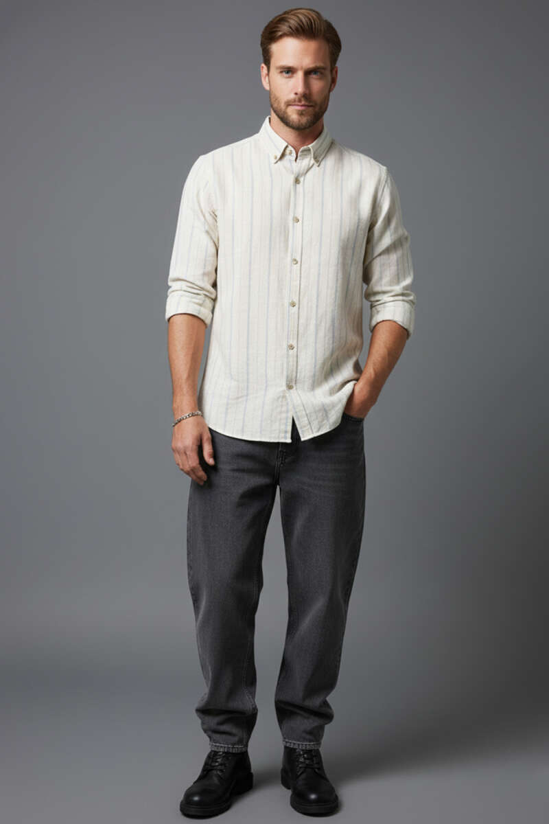 Geniş Çizgili Erkek Keten Gömlek Latte