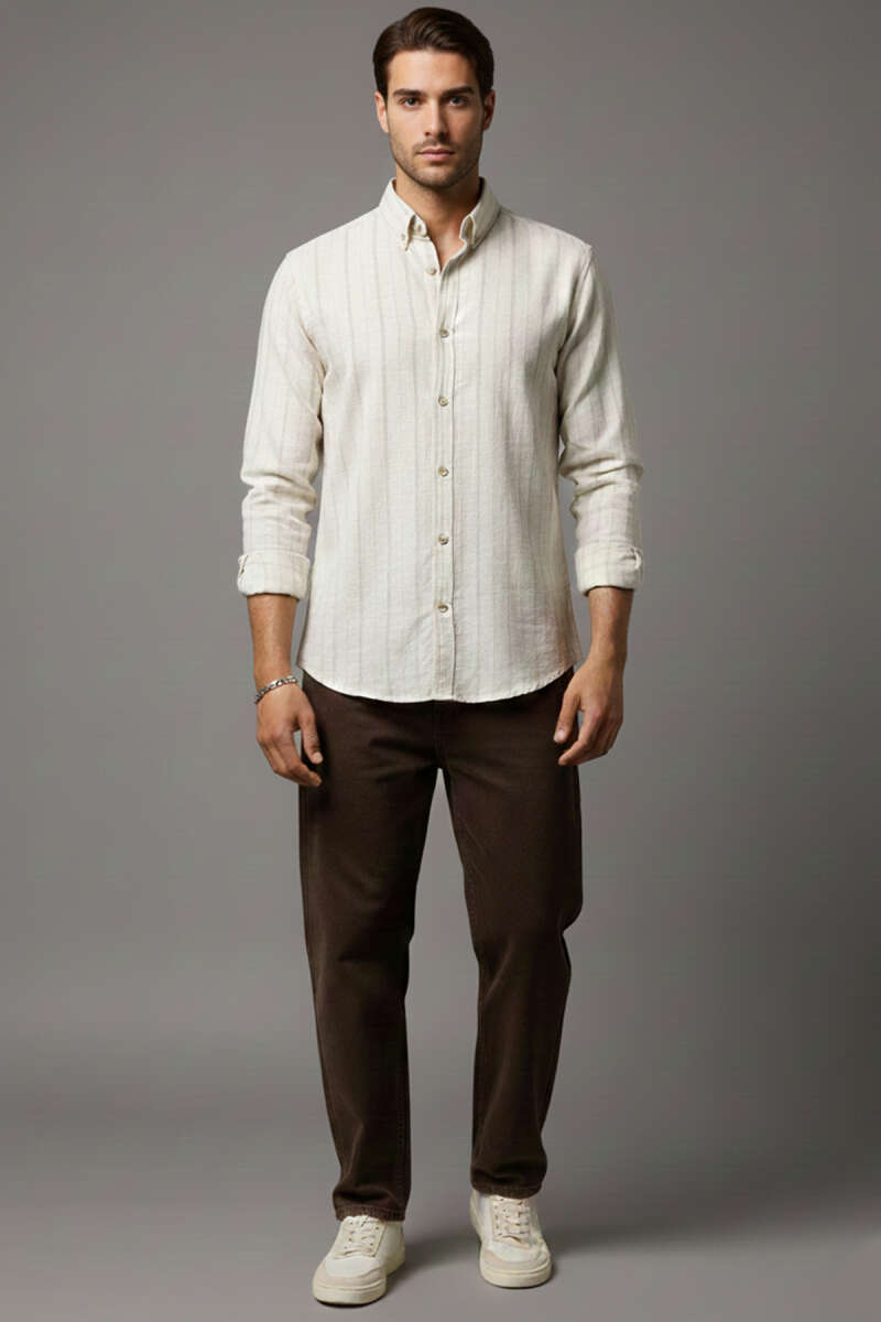 Kesik Çizgili Erkek Keten Gömlek Kahve