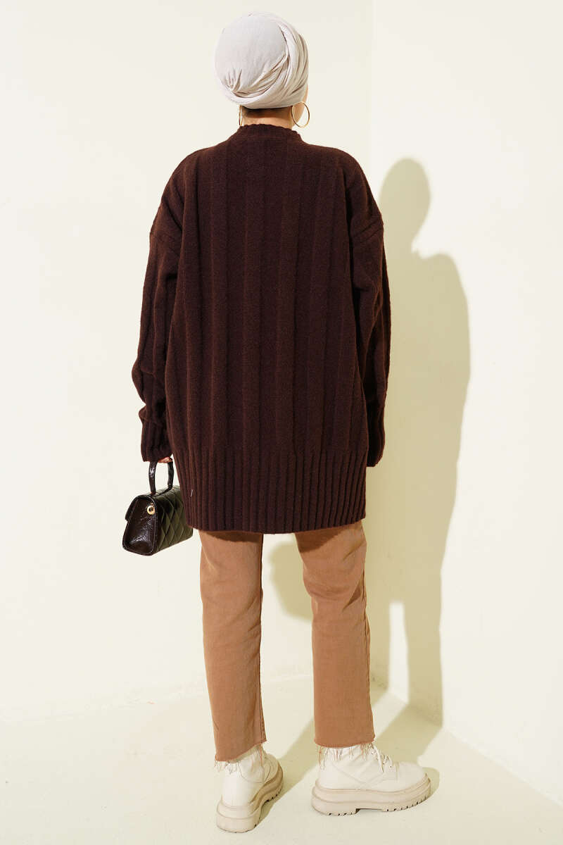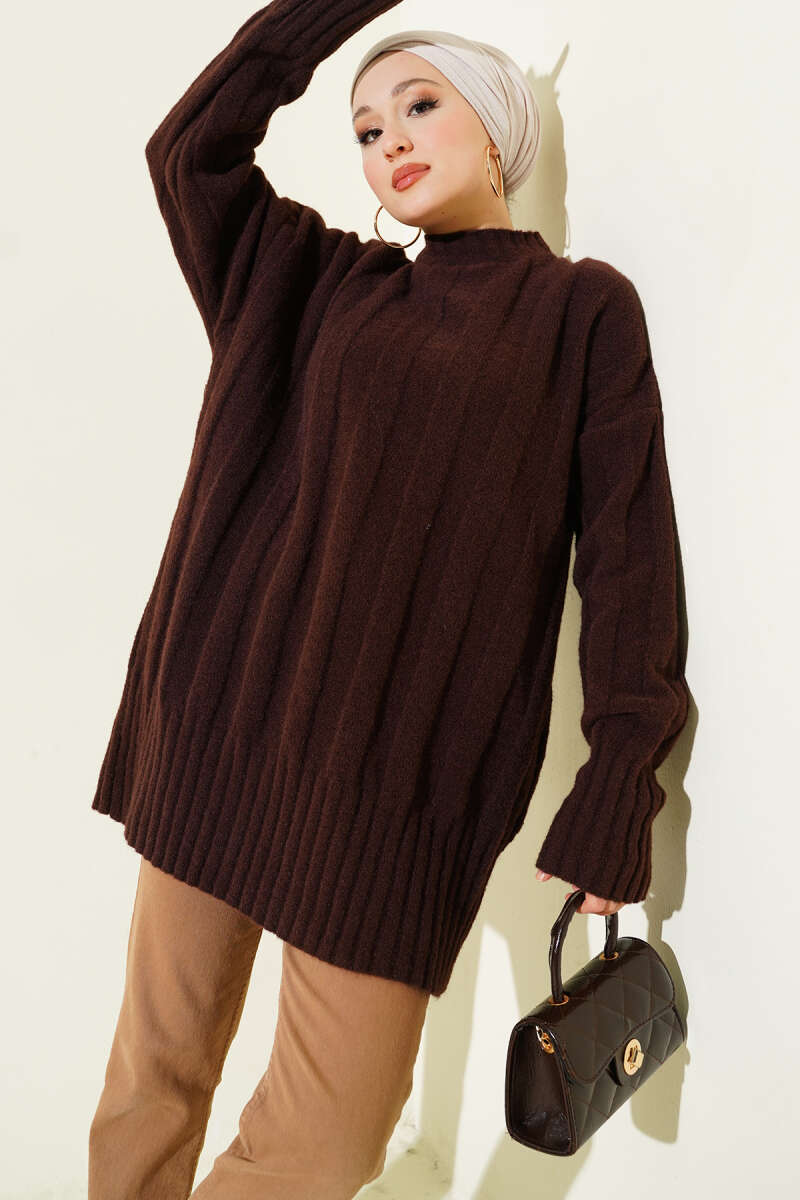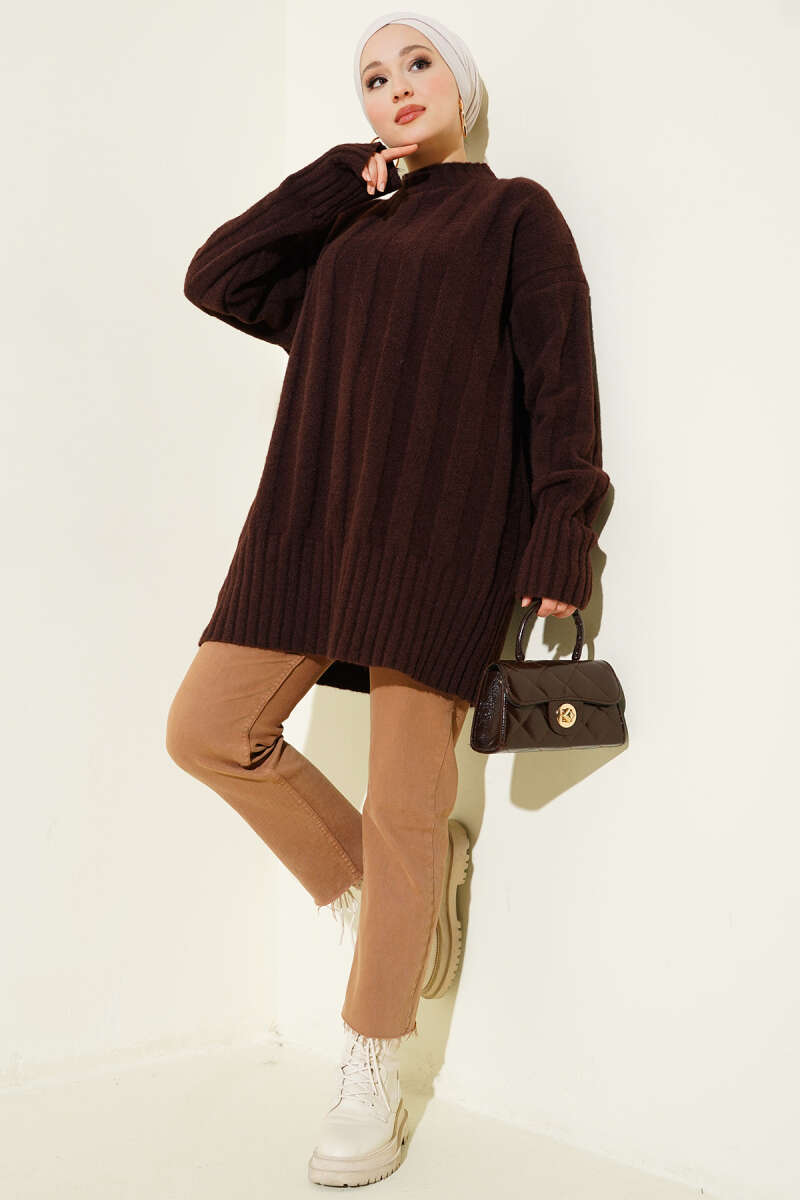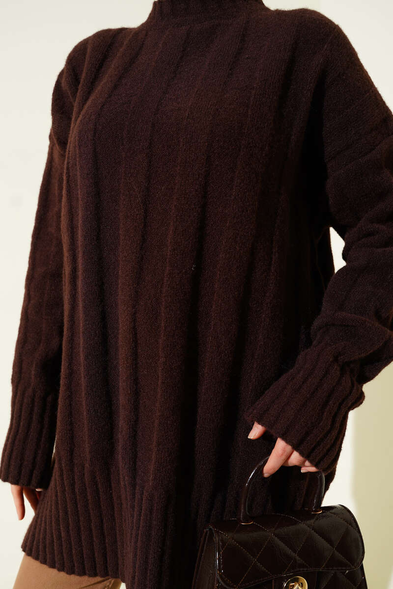 Geniş Fitilli Triko Yumoş Tunik Kahve