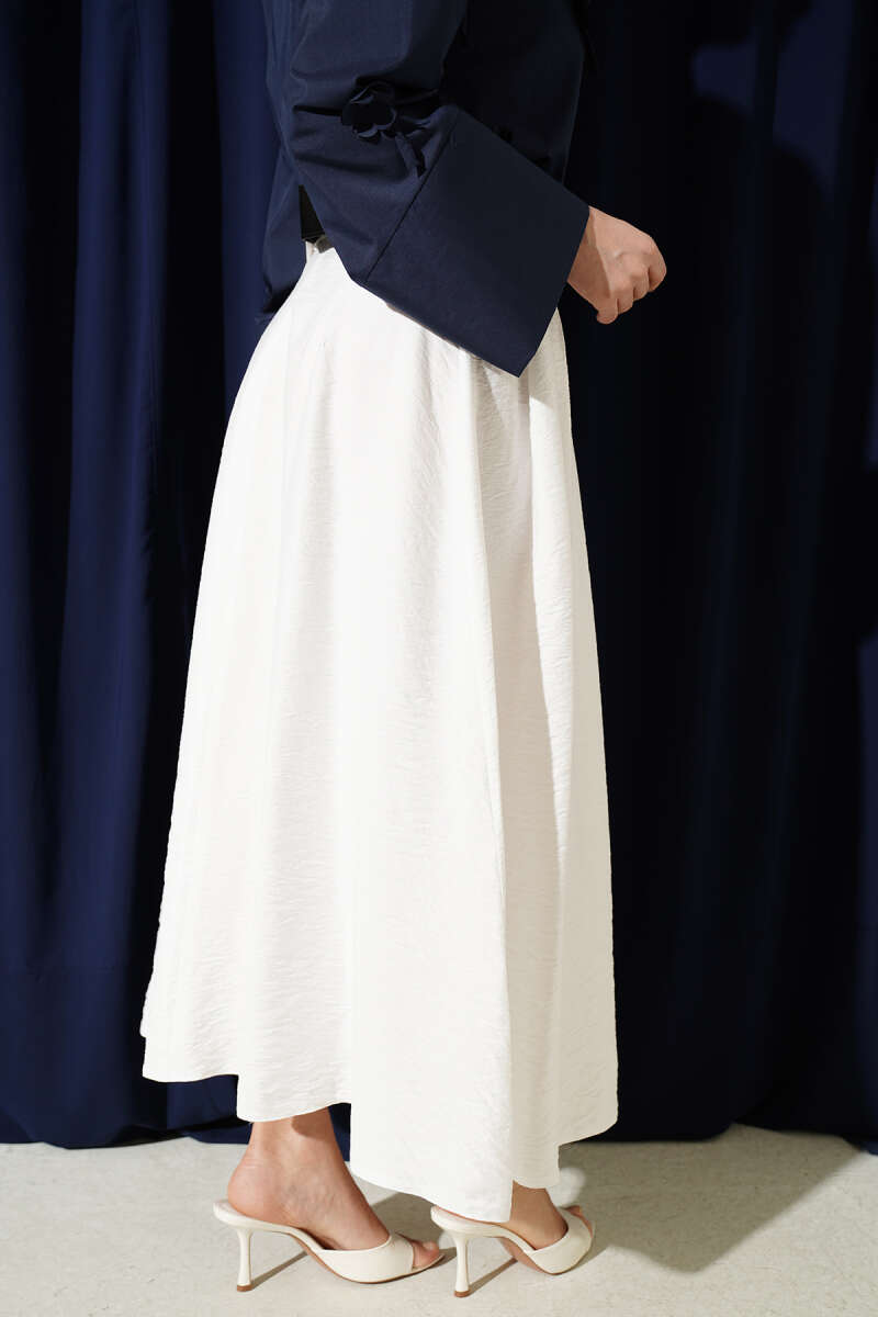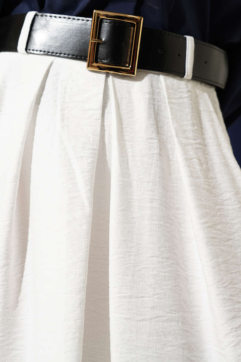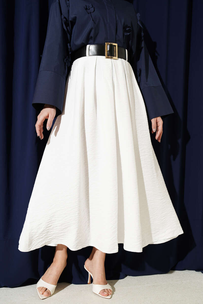 Geniş Kemer Detaylı Pileli Etek Ekru