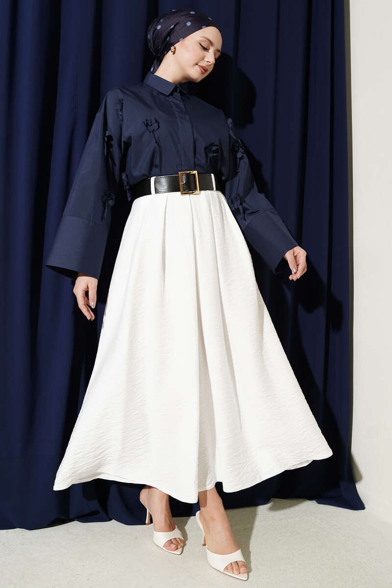 Geniş Kemer Detaylı Pileli Etek Lacivert