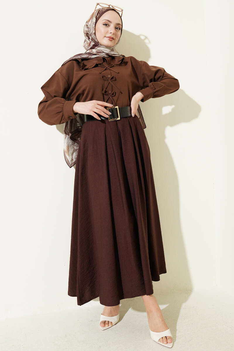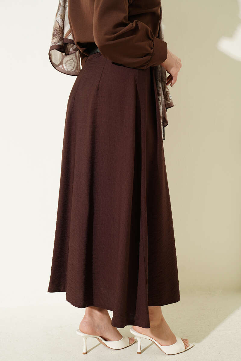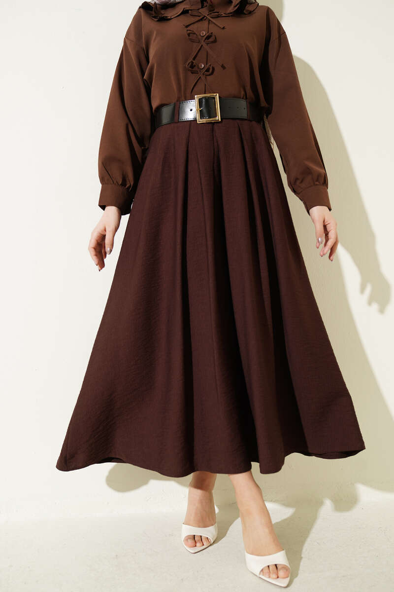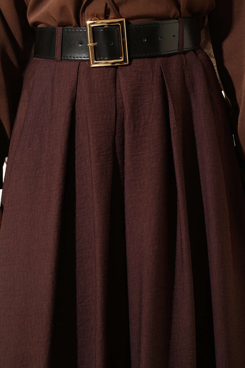 Geniş Kemer Detaylı Pileli Etek Kahve