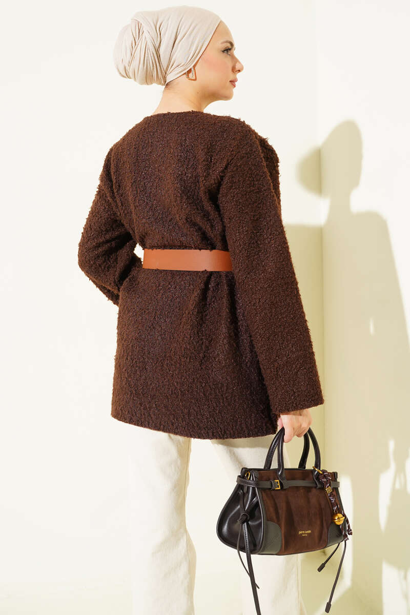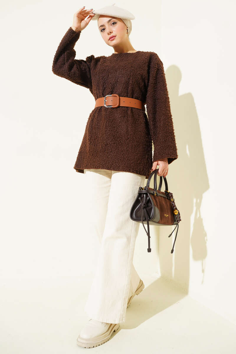 Asimetrik Kabartma Çizgili Triko Tunik Kahve