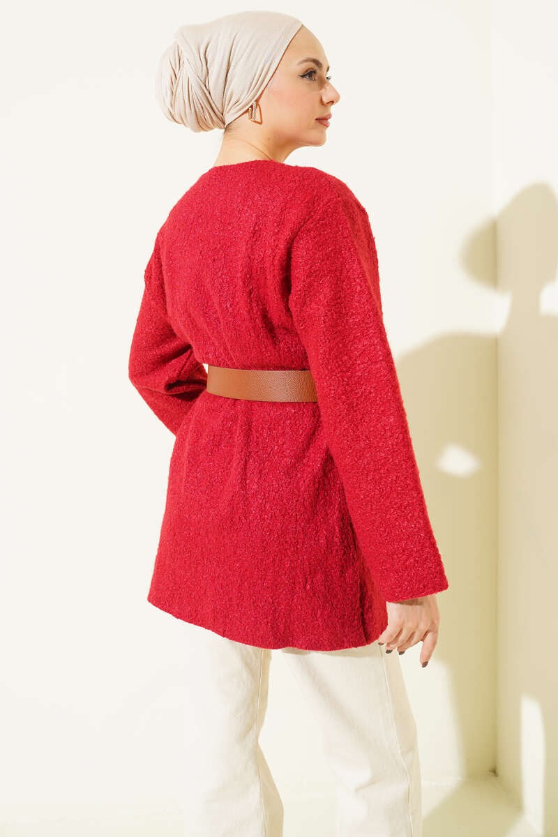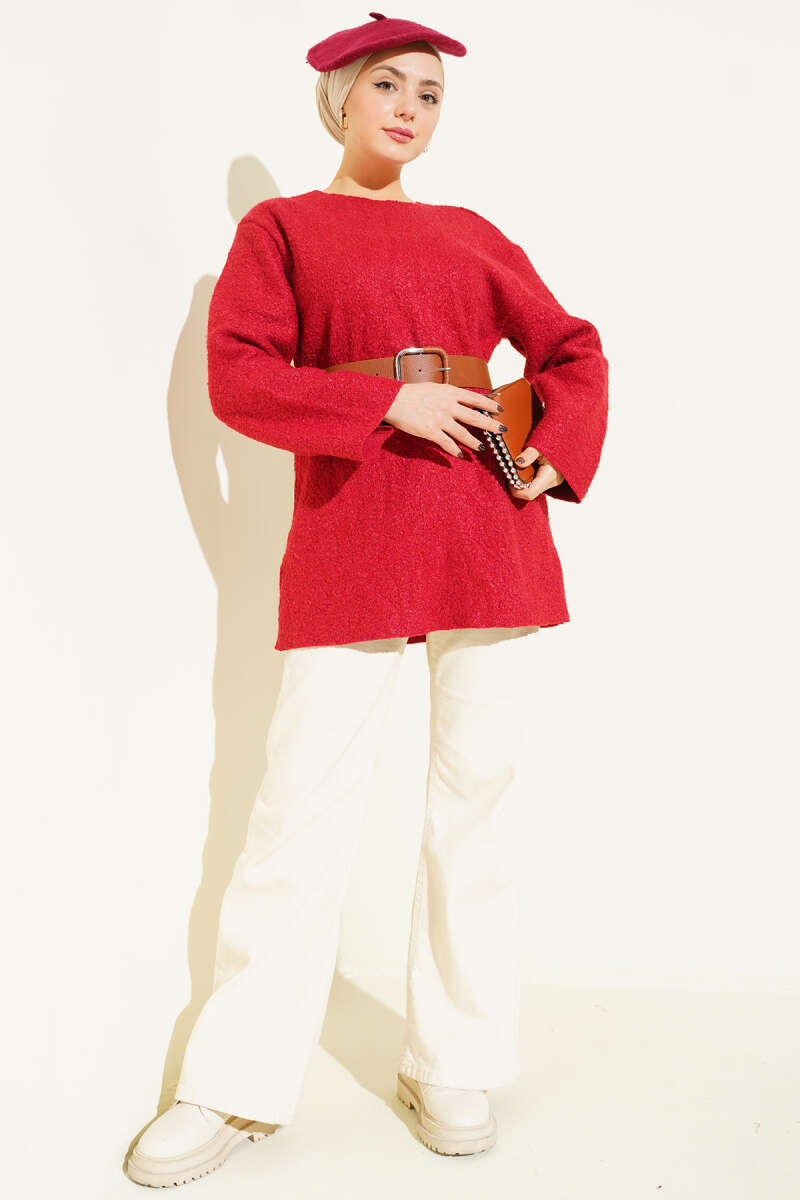 Asimetrik Kabartma Çizgili Triko Tunik Kırmızı
