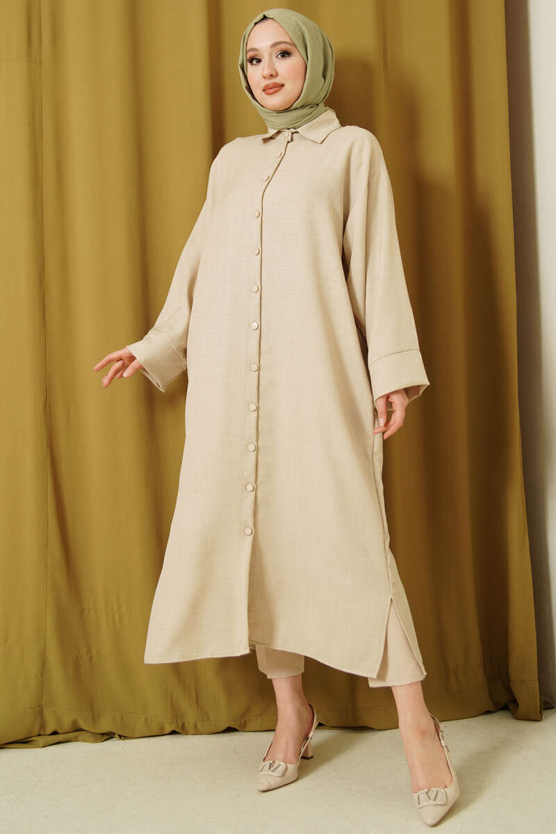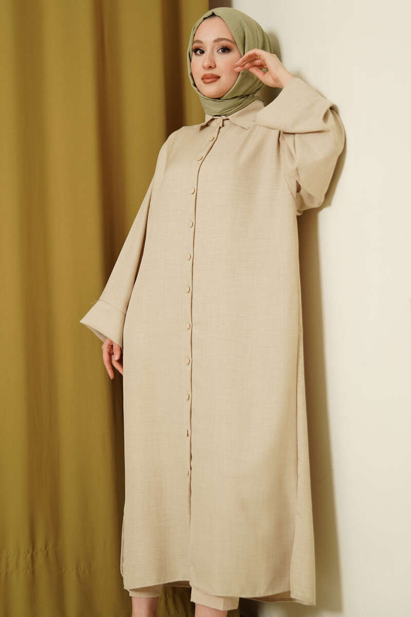 Geniş Kollu Oversize Uzun Gömlek Bej