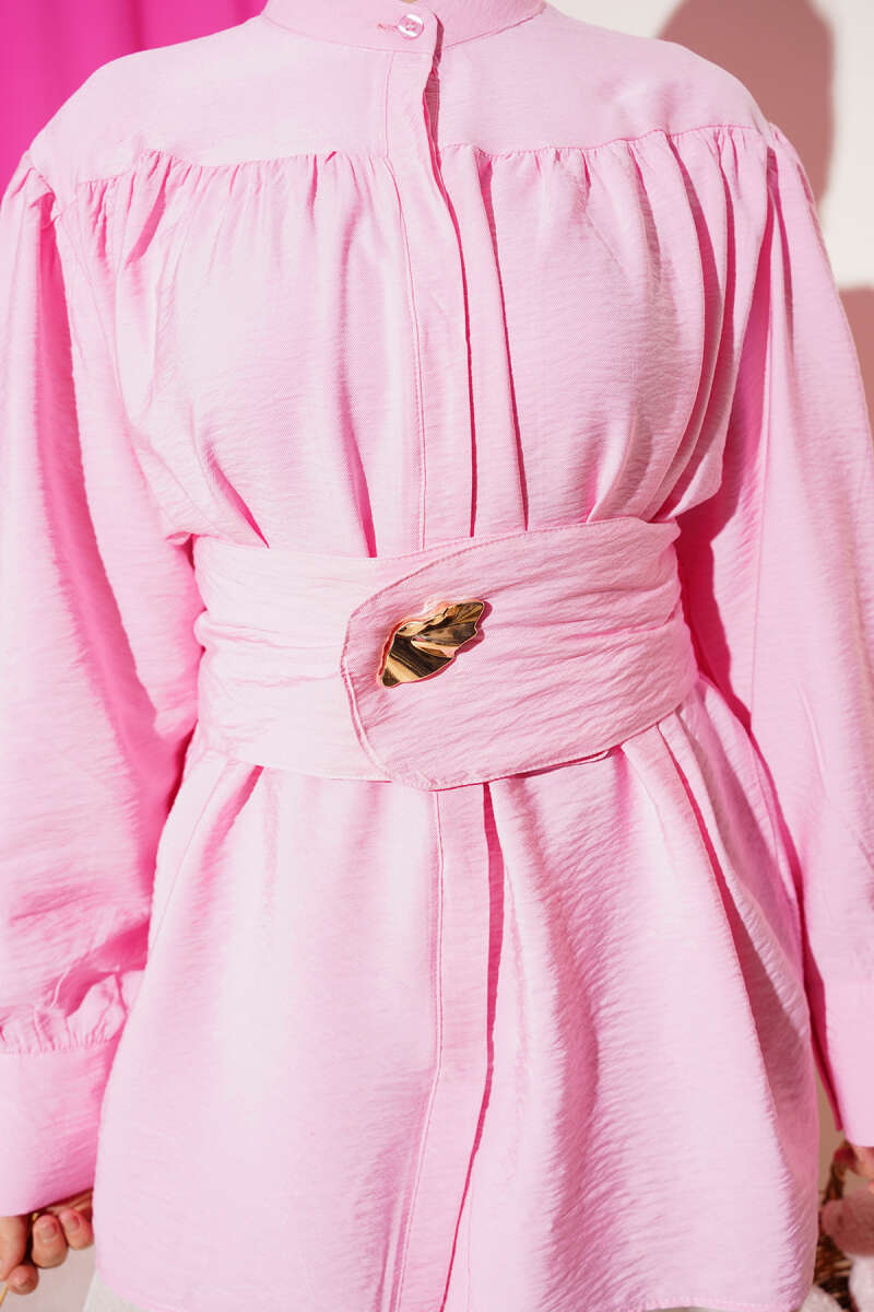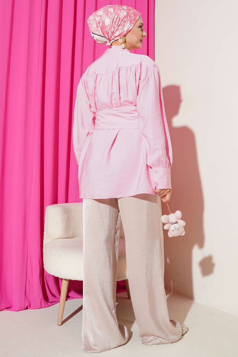 Omuz Pelerinli Taşlı Tensel Gömlek Pembe