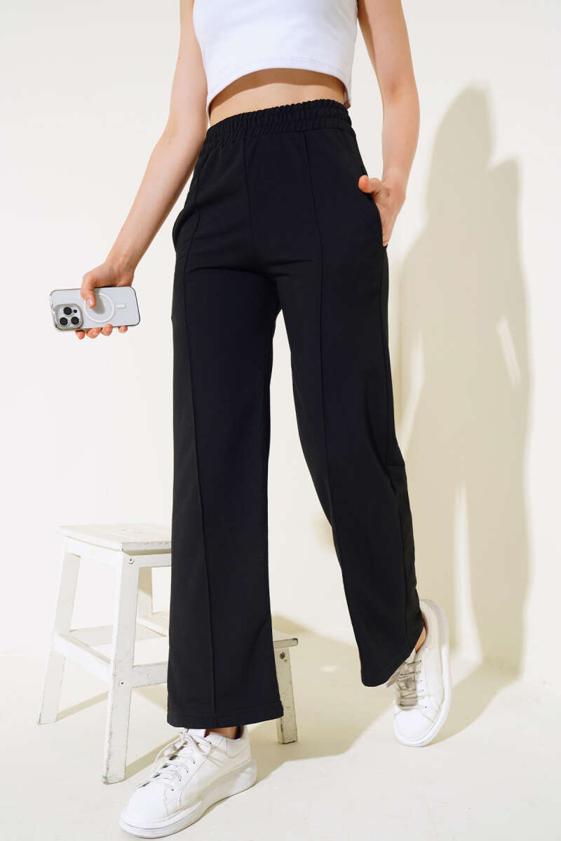 Geniş Şeritli Çıtçıtlı Loyşa Pantolon Siyah